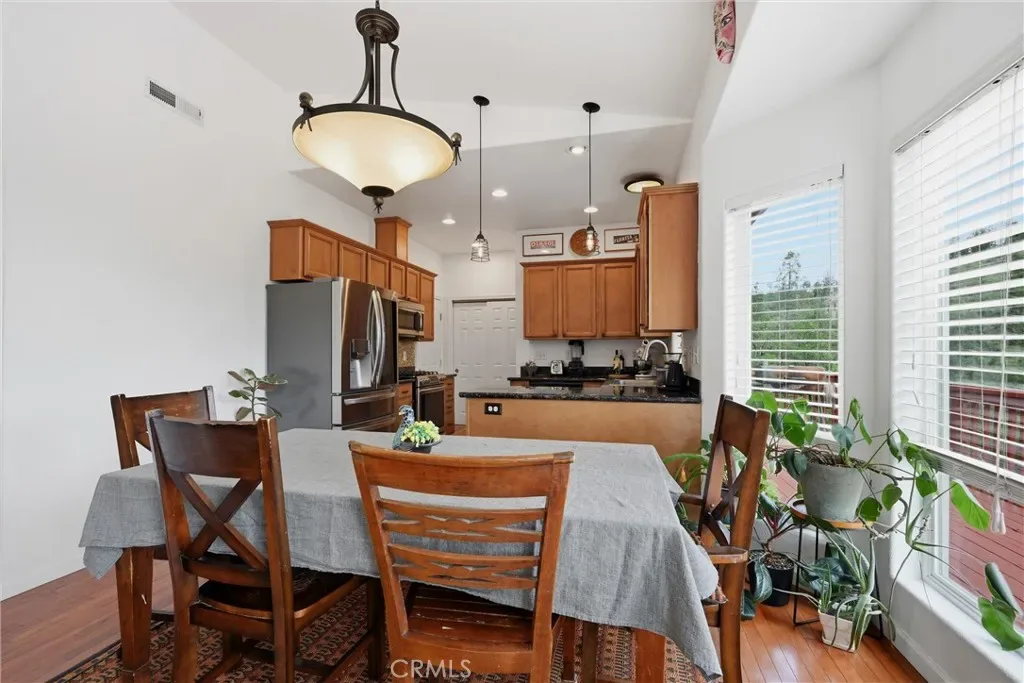 Spanning 2,306 sq ft, the home features a thoughtful layout designed for both comfortable living and entertaining. The main level welcomes you with a bright living room showcasing hardwood floors, vaulted ceilings, picture windows, and a cozy wood stove for chilly mountain evenings. The kitchen is well-appointed with maple cabinetry, stainless steel appliances, granite countertops, two pantries, and a separate laundry room.