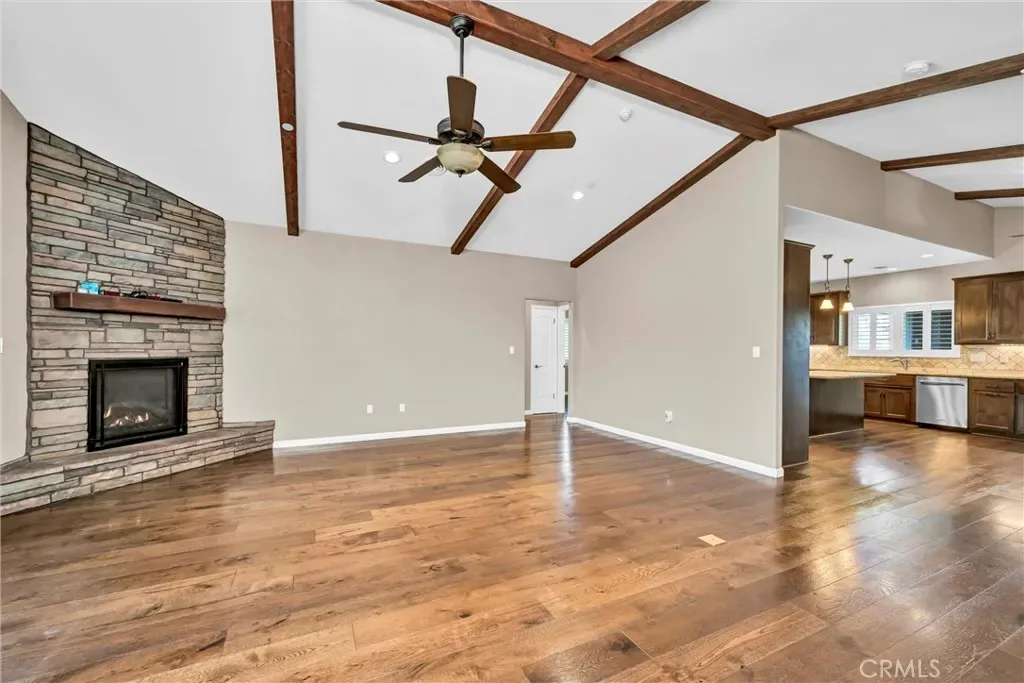 Discover this exceptional 3-bedroom + office, 2.5-bath home, built in 2016, offering 2,048 sq. ft. of beautifully designed living space. Featuring an open floor plan with a striking beamed and vaulted ceiling in the living room, this home is perfect for both relaxation and entertaining. A cozy gas fireplace adds warmth to the living room, while a second outdoor fireplace under the covered patio creates an inviting space for year-round enjoyment.