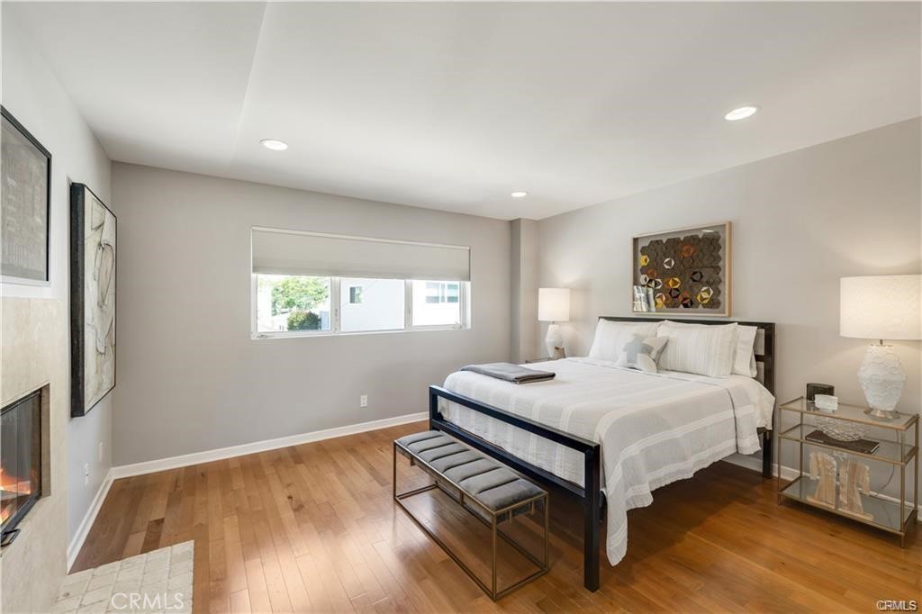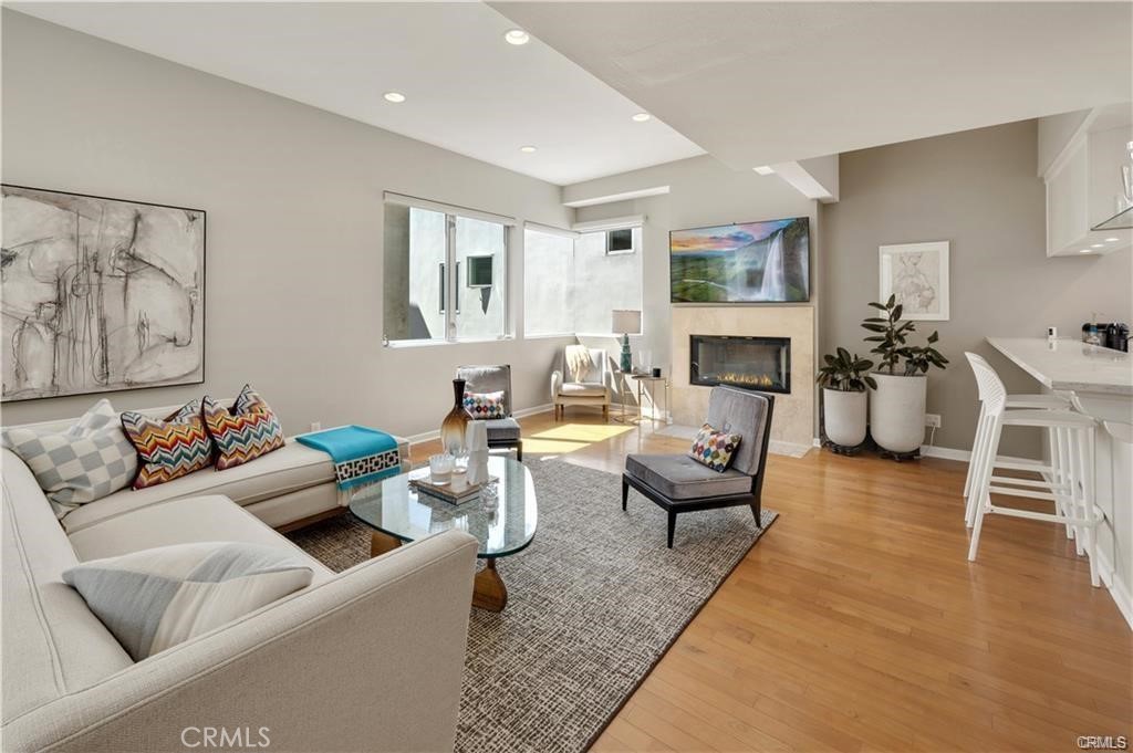 Stunning rear unattached condo on Poinsettia- a beautiful Corona Del Mar tree lined street. Built in 2005, this Strickler designed home is exceptionally light and bright, with no large homes on either side. With numerous windows, the ocean breeze and sun pour through this freestanding back unit. Enjoy the contemporary architectural details throughout as well as hardwood and travertine floors throughout the main floor. The completely upgraded kitchen includes stainless appliances, and flows perfectly into the living room with high ceilings as well as a cozy fireplace. Cook and entertain simultaneously! Large master suite is connected to the luxurious master bath by a duel fireplace. Enjoy the impressive separate soaking tup and shower. Spacious second bedroom, and full bath is upstairs with glass tile countertops. Direct access to the rooftop deck with peek-a-boo ocean views by day and twinkling lights by night. Enjoy this amazing Corona Del Mar condo and all the Village has to offer!