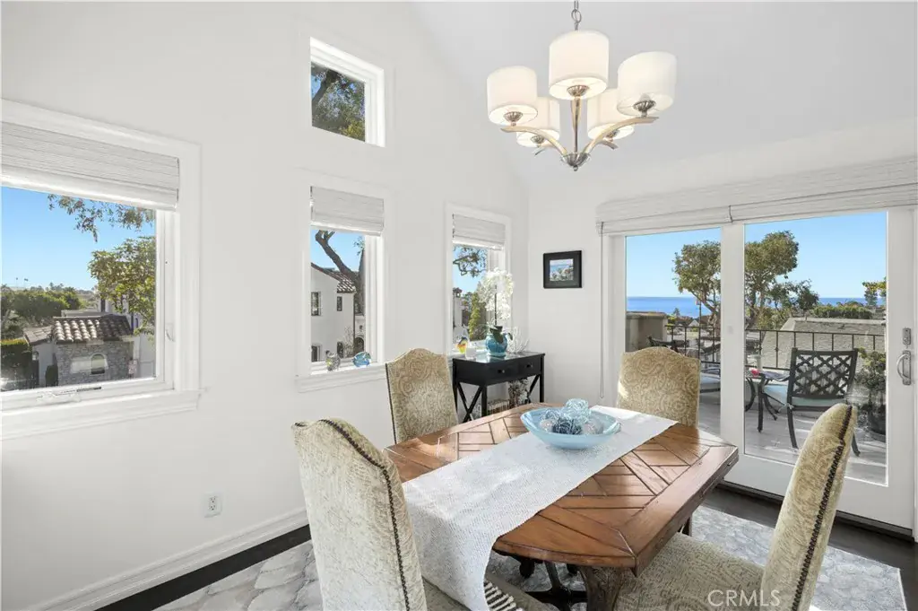 Situated on an elevated corner lot, this remodeled residence offers breathtaking, wraparound panoramic views from the main living spaces and front courtyard, encompassing the Ocean, Catalina Island, city lights, Fashion Island, and Pelican Hill golf course. A quintessential front courtyard provides a peaceful sanctuary for enjoying the ocean blues, complete with a built-in firepit, water feature, BBQ and prep counters. Thoughtfully updated throughout, the home boasts soaring ceilings, rich hardwood floors, elegant wainscoting, and expansive windows with custom treatments that frame the dramatic vistas. Cascading quartz countertops, newer appliances, abundant cabinetry, and a breakfast bar define the kitchen, which seamlessly flows into the dining area. A striking stacked-stone fireplace with hearth, flanked by walls of glass, centers the living room. Additional amenities include: central air conditioning, an alarm system, inside laundry, and generous storage. French doors open from the primary suite to reveal blackout shades, a luxurious bathroom with dual sinks, ample storage, an expansive walk-in shower with multiple showerheads, and a large walk-in closet. Two secondary bedrooms, all on the same floor, share an elegant bathroom featuring a tub/shower combination, a sizable vanity, and stunning imported Spanish tile. Completing the home is a finished garage appointed with California Closets® built-ins, epoxy flooring, and a large wall mirror. With three bedrooms and two-and-a-half baths, this home blends spectacular views with thoughtful upgrades, just down the street from Little Corona. Live the Corona del Mar Lifestyle with proximity to famed beaches, blue-ribbon schools, fine dining, and exquisite shopping.