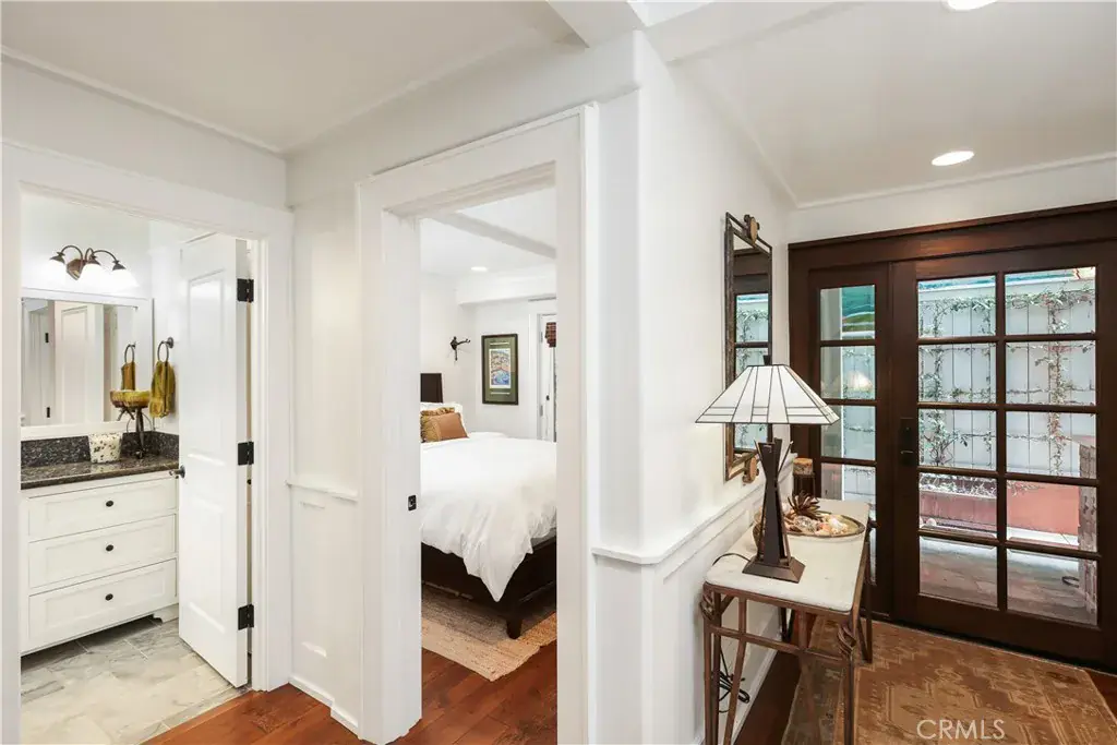 Tucked away on a quiet, tree-lined street in the heart of the flower streets, this rare 3-bedroom, 3-bath back unit beautifully blends timeless Cape Cod charm with modern comfort. The inviting floor plan features a main-level bedroom and bath, ideal for guests or a home office. The garage with epoxy flooring and an additional carport offer convenience and practicality. Upstairs, soaring ceilings and abundant natural light create ambiance in the open concept living room and kitchen. The kitchen boasts a large island, generous cabinetry, and elegant finishes, while the adjacent covered loggia with a fireplace provides a serene, private space for morning coffee or evening gatherings. Also on this level is a secondary bedroom and full bath, along with laundry conveniently located on the main living floor. The spacious primary suite offers a walk-in closet and a luxurious bathroom featuring a soaking tub, separate walk-in shower, and dual marble vanities. Up the stairs, a rooftop deck awaits—a cozy perch overlooking the iconic flower streets, with views framed by lush trees and the charming village surroundings. With its high-end traditional Cape Cod design, detailed millwork, wainscoting, and rich wood floors, this home exudes warmth, sophistication, and the quintessential Corona del Mar village lifestyle—all just moments from the beaches, boutiques, and world-class dining.