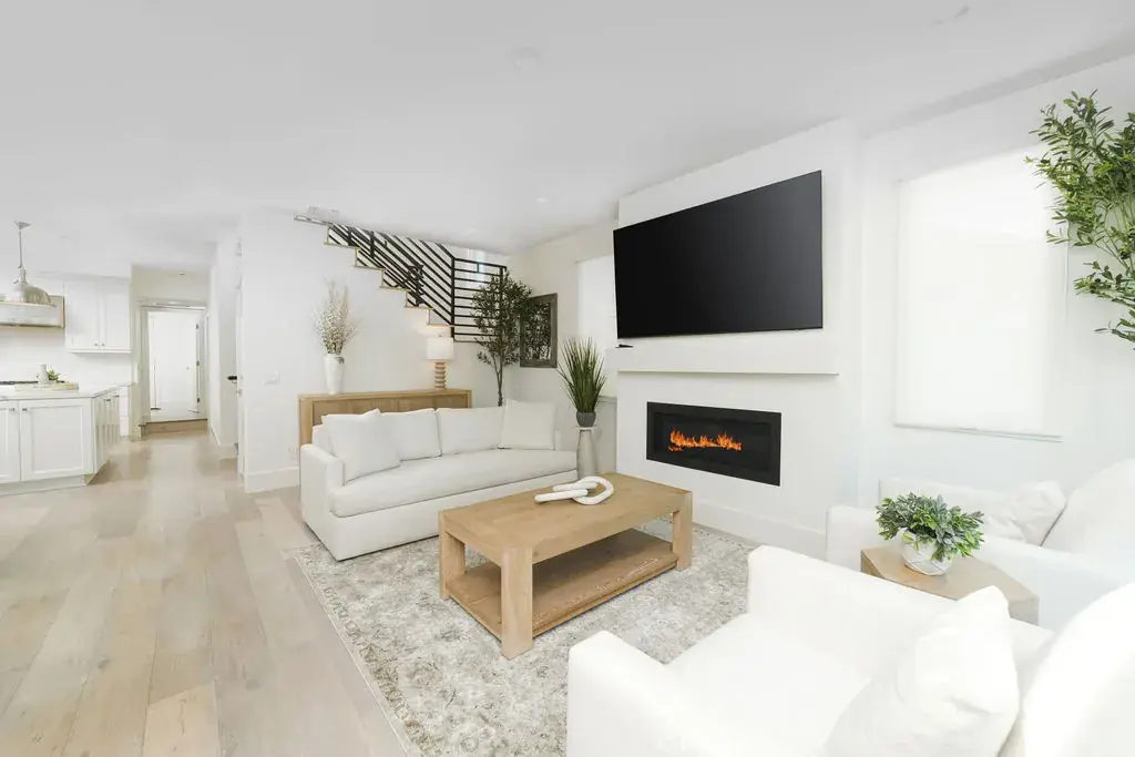 The open-concept living areas are flooded with sunlight, showcasing soaring ceilings, European white oak floors, and a sophisticated neutral palette. The living room features a sleek custom fireplace and French doors that open to an expansive front patio—perfect for entertaining or relaxing in true coastal style.