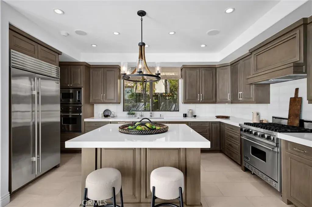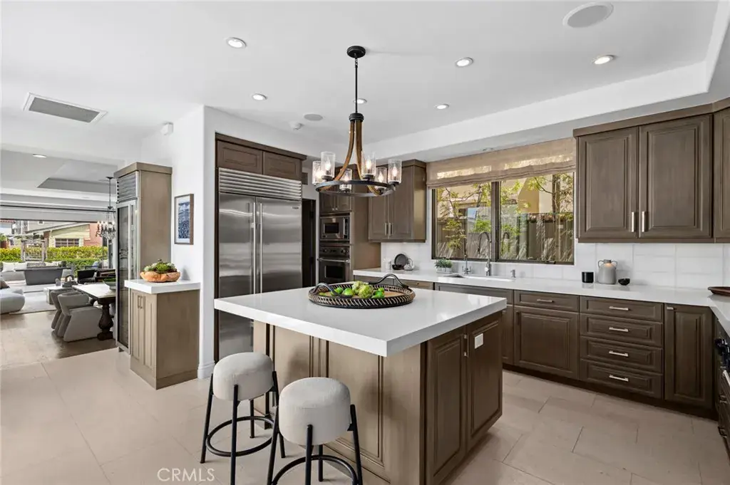 The modern kitchen, with high-end appliances and a spacious island, flows into a welcoming family room with a fireplace and adjacent breakfast patio, ideal for gatherings or quiet mornings.