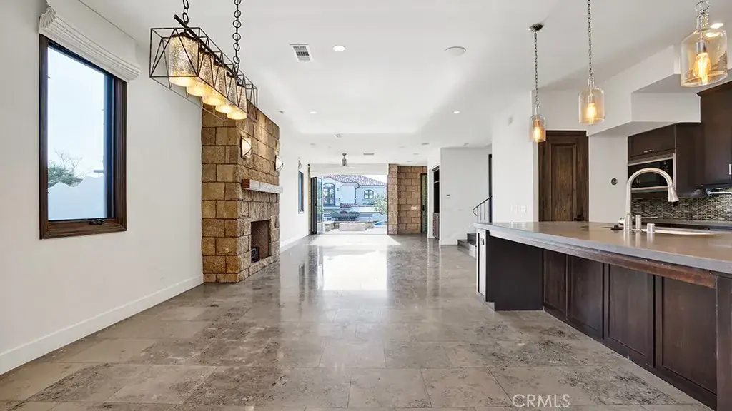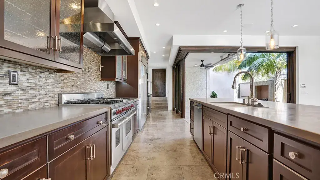 Designed for elevated everyday living, the kitchen centers around an oversized cement-topped island with generous preparation space, premium integrated appliances, a full-size wine refrigerator, and a professional-grade range complemented by a pot filler for added convenience.