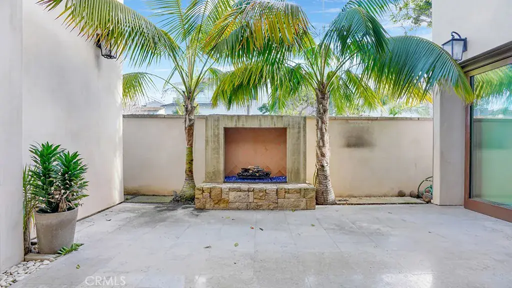 Rear patio extends the living experience with a statement fireplace and tranquil water wall feature, creating a serene backdrop for evening gatherings.