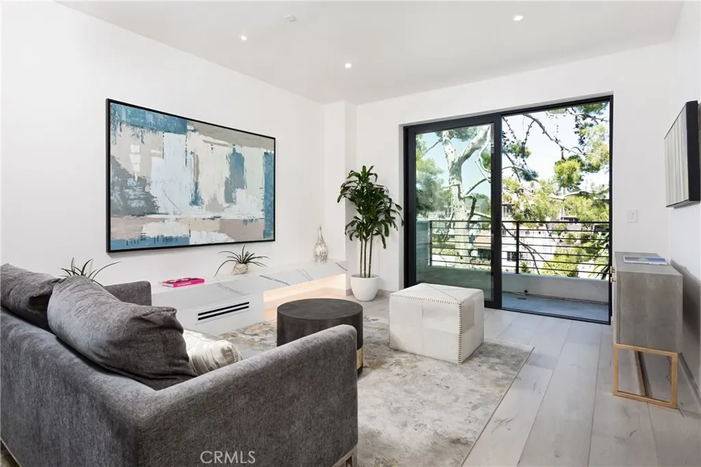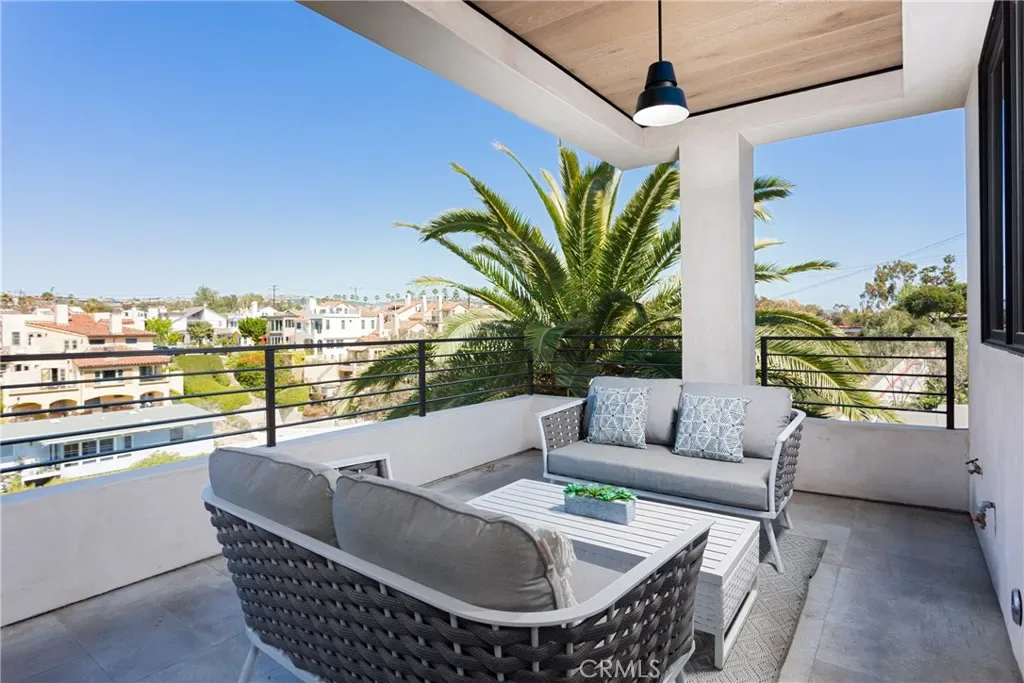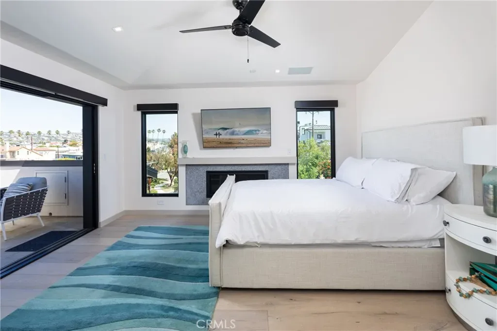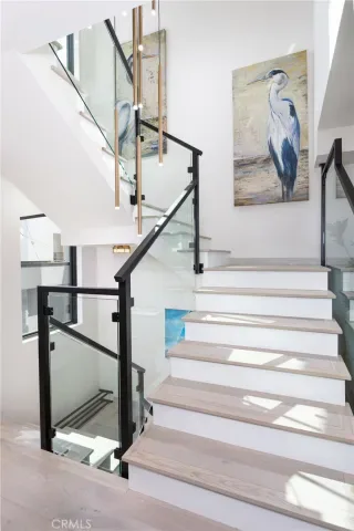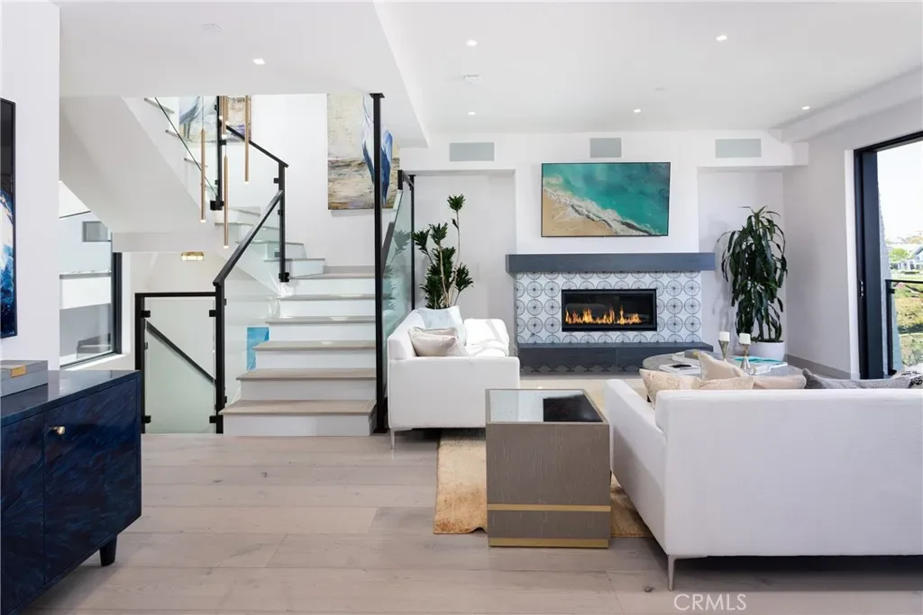 The Dramatic foyer features a floating glass staircase that compliments the high ceilings and open floor plan. A spacious living room with a contemporary glass fireplace and a balcony that provides stunning views of Begonia park & Fashion Island.