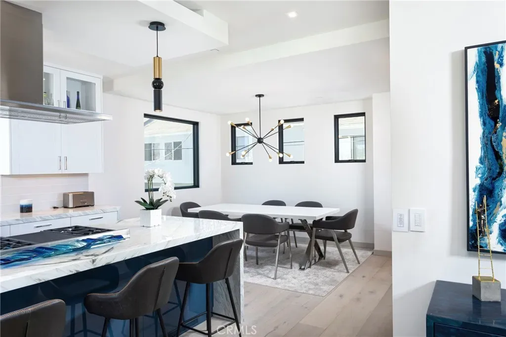 The large open Chef’s kitchen and dining room features Miele appliances, textured self closing doors and drawers, an oversized Quartz island with seating for 4 and and a large round dining table for 8, designer light fixtures, wide plank hardwood flooring and European hardware.