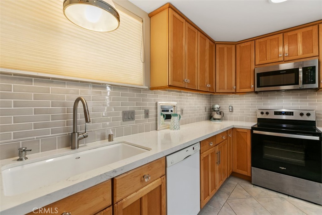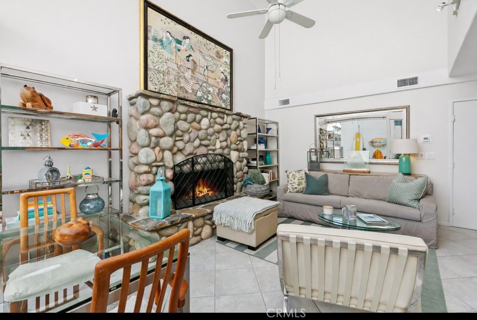 Live the Dream at the beach in this charming 3-bedroom and 2-bath back unit in desirable Corona del Mar Village community. Light, bright and airy, this home has an open floor plan and cathedral ceilings. Beautifully remodeled kitchen with quartz counter tops, classic subway tile backsplash, newer electric range oven and an open eating counter looks on to the living room. Spacious living room has dramatic ceilings with stunning floor to ceiling windows and a cozy natural stone fireplace. Three bedrooms are upstairs with two bathrooms. The primary bedroom is quite spacious with its ensuite bathroom. Private front patio leads to the dutch door for easy beach living. Inside laundry room goes to an attached garage with plenty of storage. Some of the best beaches, world-renowned restaurants and shopping are just minutes away.