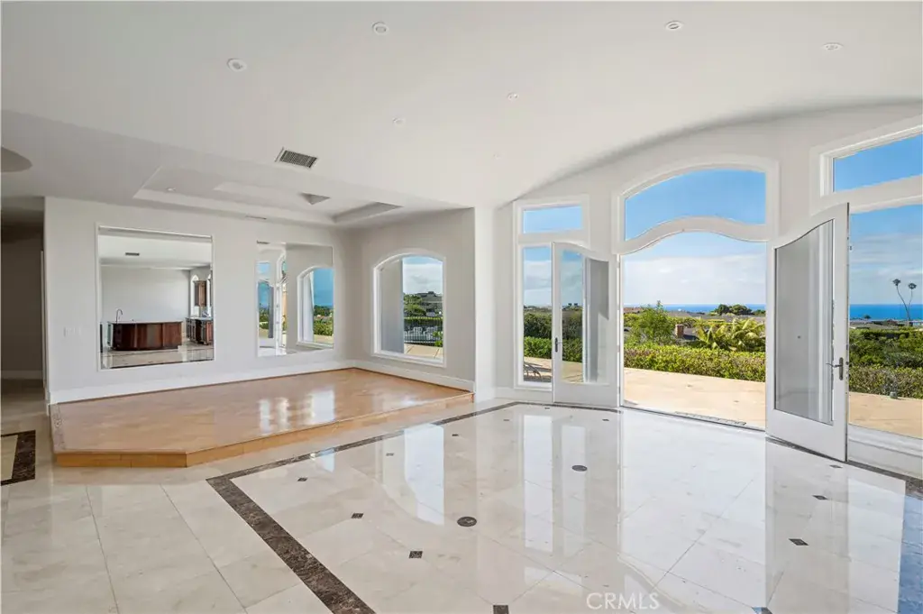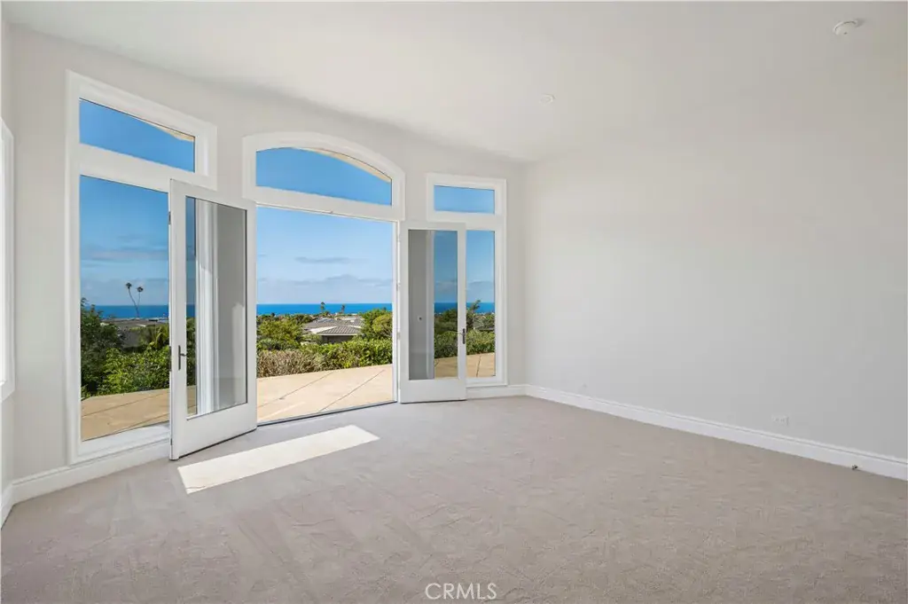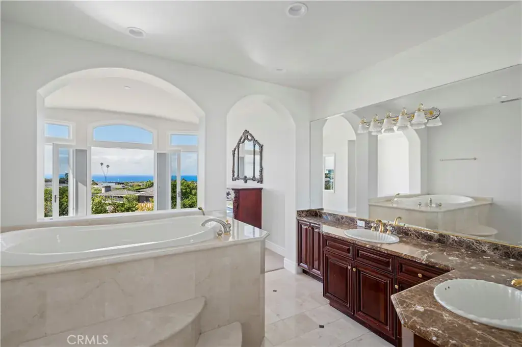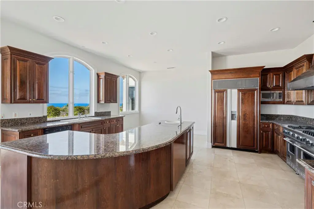 Grandeur meets coastal elegance at this gated estate, introduced by a stately fountain and dramatic entry. Inside, soaring ceilings frame breathtaking ocean views from nearly every room. Designed for entertaining, the expansive chef’s kitchen showcases granite counters, a six-burner Viking range with griddle, SubZero refrigerator, Gaggenau induction cooktop, microwave, dishwasher, prepping sink, and a spacious layout overlooking the dining area and wet bar with custom shelving, wine storage, and sprawling counters. The formal family room with fireplace and French doors offers a warm yet private retreat. Two luxurious primary suites sit at the forefront of the view, each with walk-in closets and spa-inspired bathrooms featuring jetted tubs, walk-in showers, dual vanities, private water closets, and abundant storage. Two additional ensuite bedrooms plus a mirrored gym with mobile barre functionality provide versatility and comfort. Additional features include a private laundry room, a finished 3-car garage, and a sprawling rear yard showcasing panoramic sparkling water views.