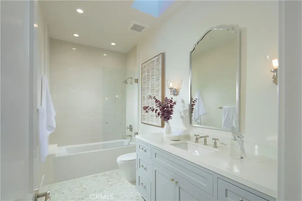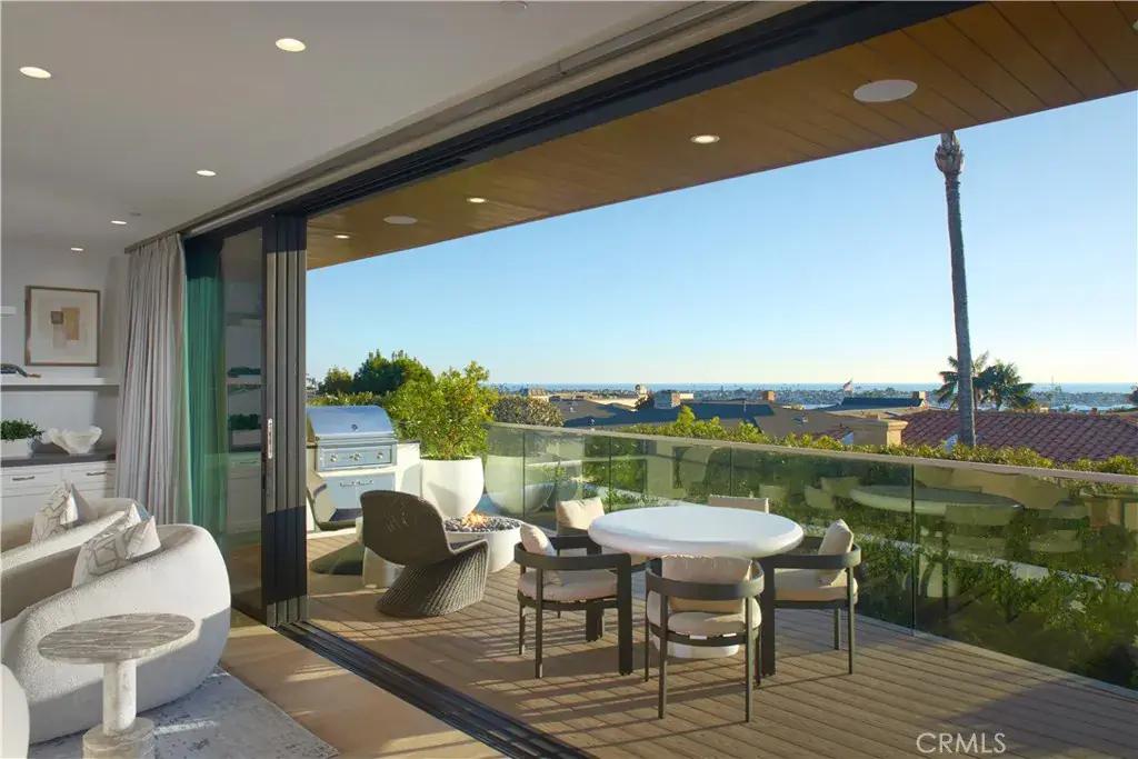 An inspired expression of coastal sophistication, this custom-built residence in the prestigious enclave of Irvine Terrace captures panoramic views of the Pacific Ocean, Newport Harbor, and Catalina Island. Designed by Brandon Architects, the home blends East Coast elegance with modern California ease—where light, scale, and craftsmanship unite effortlessly. Encompassing approximately 3,863 square feet on a 7,552-square-foot lot, the residence features four bedrooms, four full baths, and one half bath. A dramatic 14-foot entry framed by skylights reveals airy interiors bathed in natural light, while soaring ceilings, white oak flooring, and refined millwork create a timeless coastal backdrop. Centered around a sleek marble fireplace, the open-concept great room flows into the dining area and gourmet kitchen—showcasing a quartzite island with seating for six, Thermador appliances, custom cabinetry, and a walk-in pantry with wine storage and beverage cooler. Retractable glass walls open to an expansive ocean-view terrace with built-in BBQ, fire pit, and multiple seating areas designed for effortless entertaining and sunset views. Serenity defines the primary suite, featuring a sitting area, fireplace, and panoramic coastal vistas. Dual vanities, a soaking tub, skylit shower, and boutique-style walk-in closet complete the spa-inspired bath. Additional highlights include a versatile media room, custom-designed laundry, and a two-car garage finished with epoxy floors, built-ins, and overhead storage. Positioned moments from Newport Beach Country Club, Fashion Island, and Balboa Island, this home captures the essence of refined coastal living in one of Newport’s most sought-after neighborhoods.