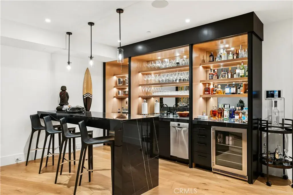 On the lower level, the home shifts into entertainment mode. This stunning lounge features multiple seating areas, a billiards space, and a striking black-porcelain bar with a refrigerator, dishwasher, and ice maker—everything you need to host effortlessly.