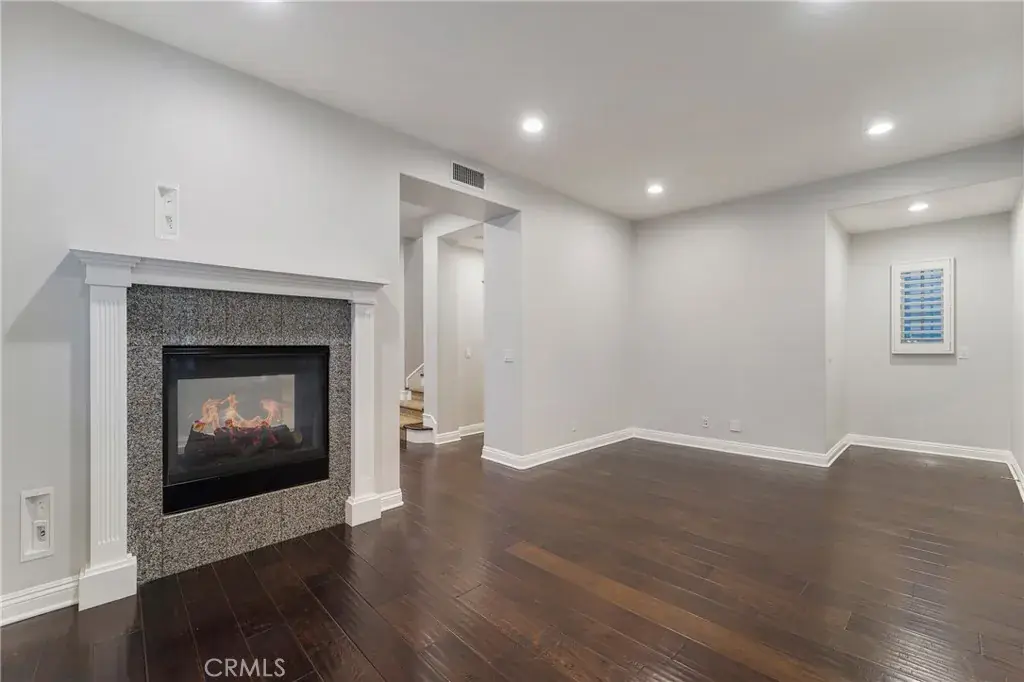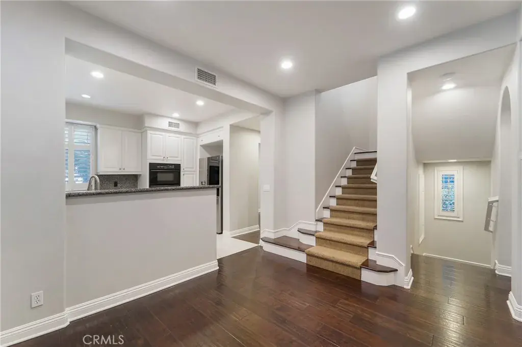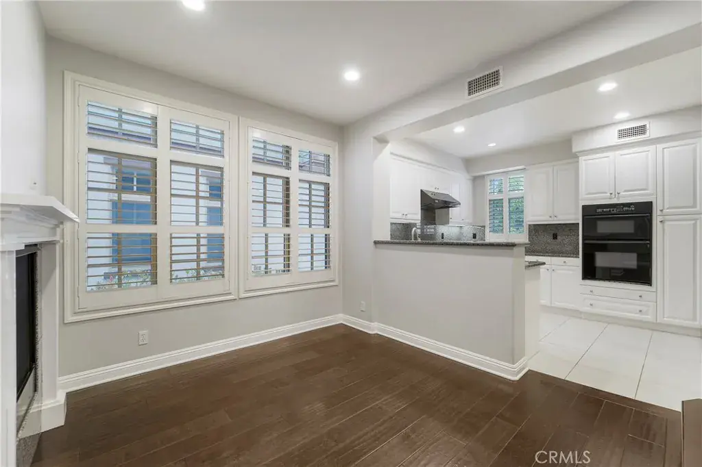 The interior is refined and inviting, showcasing rich wood flooring throughout, a warm and modern palette, and custom window coverings that complement the home’s clean architectural lines. The heart of the home is the kitchen—both stylish and functional—featuring granite countertops, abundant cabinetry, and an ideal layout for entertaining, casual dining, and everyday living.