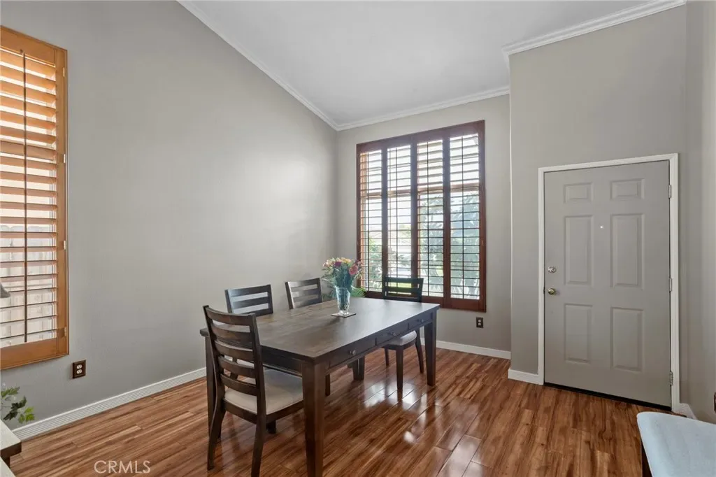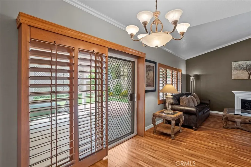 Located in South Corona’s Chase Ranch, this home offers inviting curb appeal and a well-designed layout that blends functionality with everyday comfort. A formal sitting room or dining area welcomes you in, leading to an open floor plan ideal for both daily living and entertaining. Inside, plantation shutters, crown moulding, and high quality laminate flooring create a cohesive and polished interior. The family room is centered around a fireplace with custom iron doors, adding warmth and character. Natural light fills the space through two sliding glass doors, located in the dining room and a bedroom, providing an easy connection to the outdoors.