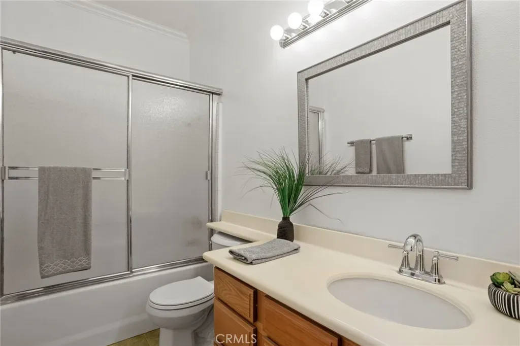 The primary suite features a walk-in closet and an updated bathroom with a new toilet and shower door. The guest bathroom has also been refreshed with a new toilet, continuing the consistent improvements throughout the home.