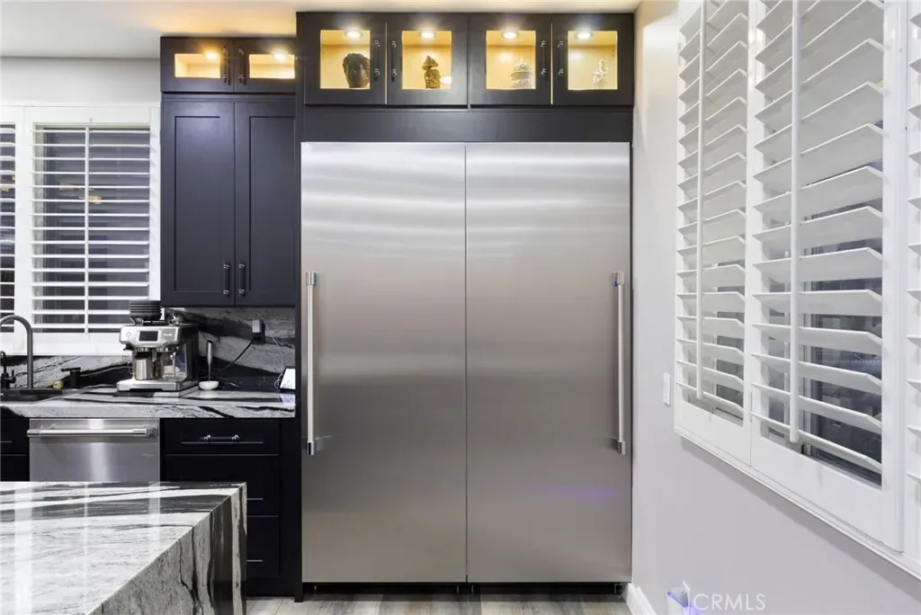 At the heart of the home is a fully upgraded chef’s kitchen featuring granite countertops, custom shaker cabinetry with integrated LED lighting, & a suite of top-of-the-line Thermador appliances, including an 8-burner stove with 48” hood, a dishwasher, and 60” refrigerator/freezer configuration. Professional MicroDrawer microwave is fitted into the island to compliment commercial appliances. Additional kitchen enhancements include a pot filler, instant hot water and purified water at the sink, and a built-in glass rinser, adding both convenience and a polished, luxury feel.