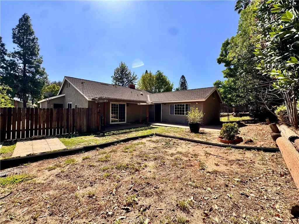 The spacious living room features a unique sunken sitting area beside the cozy fireplace, while the large primary suite opens through sliding doors to the expansive backyard with covered patio—ideal for relaxing or gatherings.