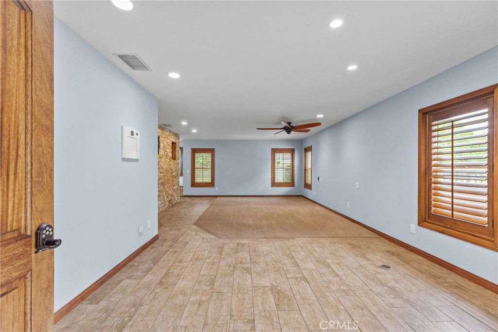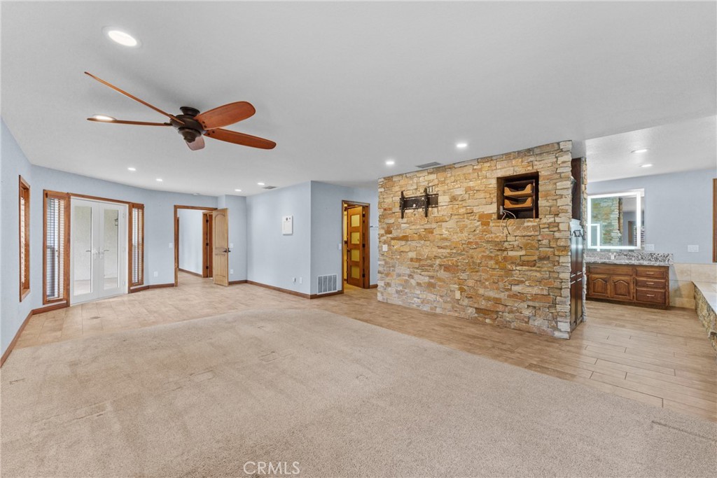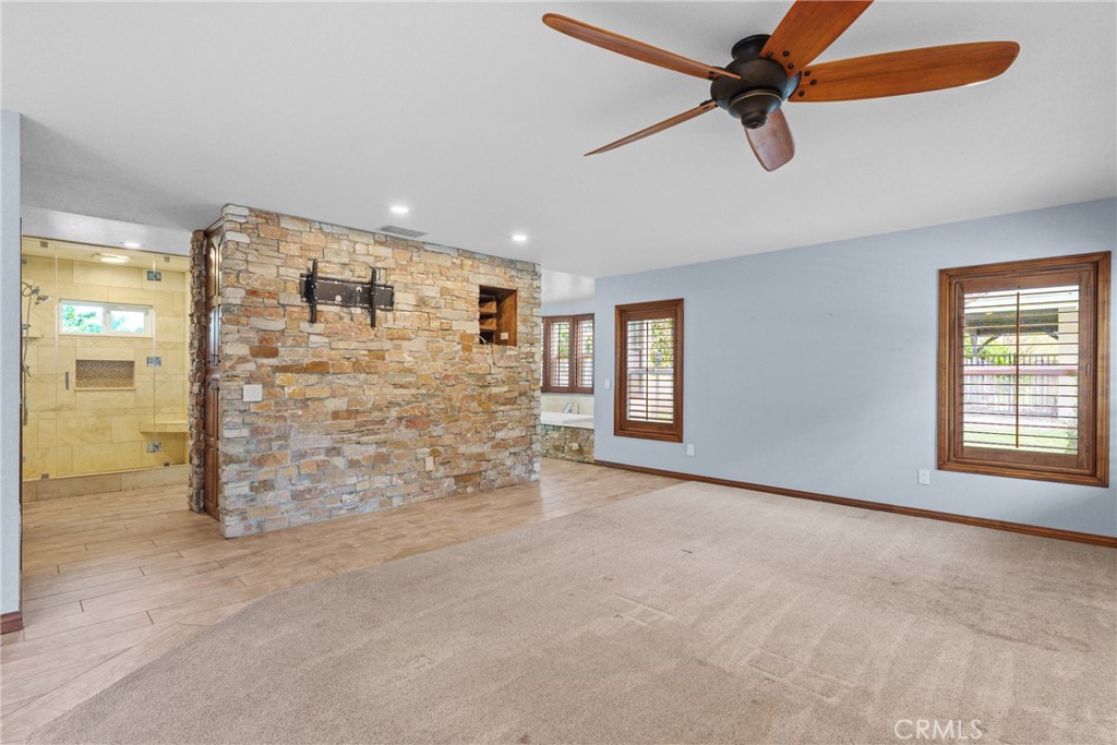 Meticulous landscaping enhances the home’s curb appeal, framing the stately exterior. Inside the single-story main residence, an open floor plan unfolds beneath recessed lighting and rich woodwork. Impressive double doors welcome guests into a dramatic rotunda foyer, from which the living area and dining alcove connect. Vaulted wooden ceilings crown the great room, where custom shelving and a striking brick fireplace establish warmth and character. Serving as a culinary hub, the entertainer’s kitchen displays a central prep island, stainless steel appliances, abundant cabinetry, and a breakfast counter flanked by a wet bar and large wine rack , ready for gatherings of all sizes and types. The comfortable retreats accommodated by ample closets and sleek, contemporary baths, are all generously sized. Your primary suite is a soothing sanctuary with an ensuite featuring a soaking tub, dual sinks, an integrated vanity, and an oversized shower.