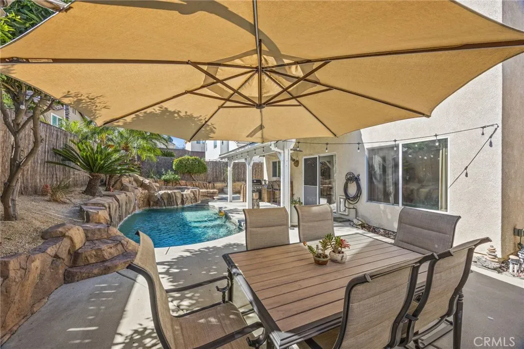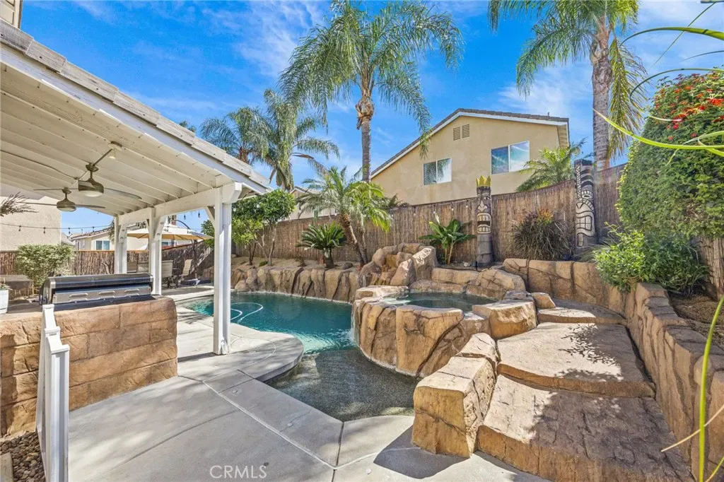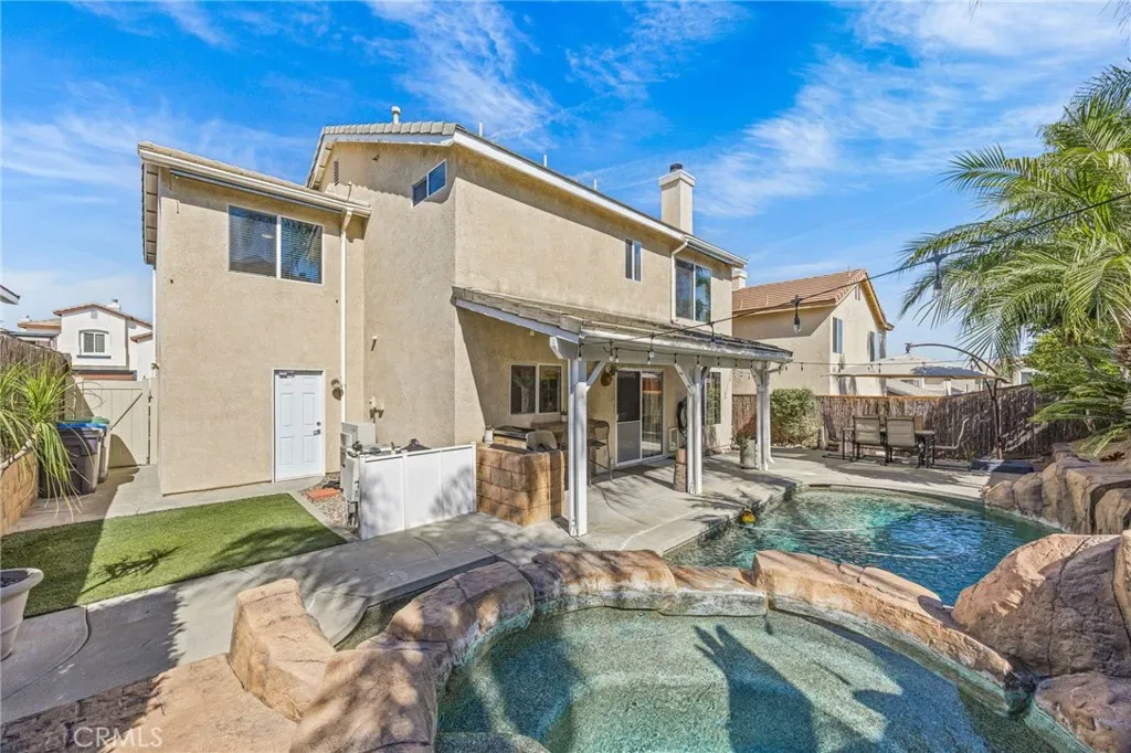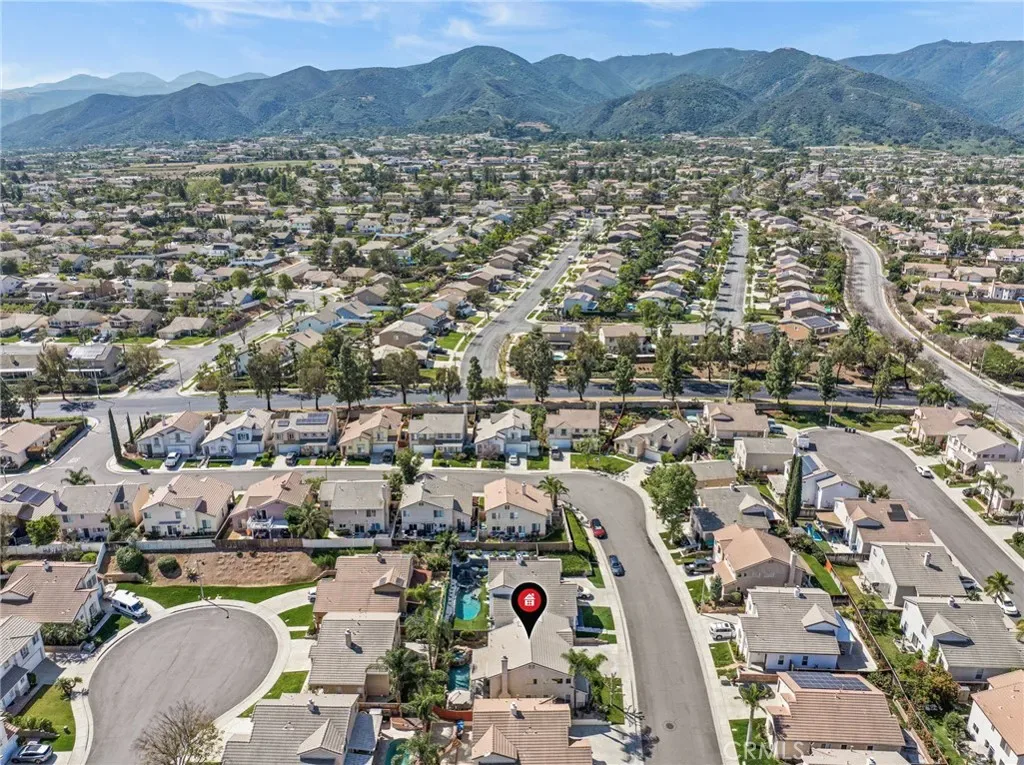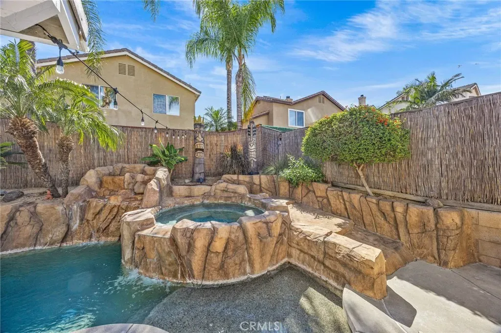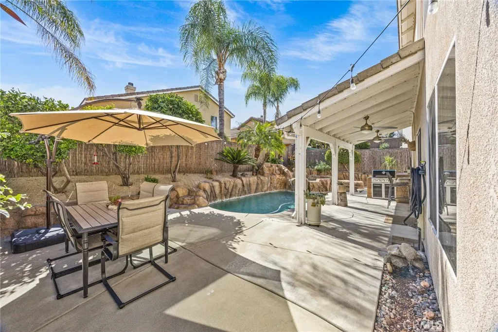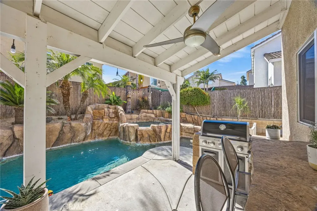 Must see beautiful South Corona pool home! This 4 bedroom, 3 bath home is in the desirable South Corona Sundance community. You can vacation in your own resort like backyard with a refreshing pool and spa, built in BBQ, patio string lights, palm trees, hand carved tiki decorations, and fruit trees. Enjoy the ease of holiday decorating with the Govee programable year-round holiday lights installed in the eaves of this home. Indoors you will find a remodeled kitchen with Quartz counter tops, tile backsplash, stainless steel appliances, soft closing cabinets and drawers, walk in pantry, and a unique decorative ceiling. The living room is impressive with wood flooring, soaring ceilings, and lots of windows that fill the space with natural light. Upstairs there are 4 bedrooms with plenty of room for kids or guests. You will be able to rest in comfort with a newer 18 SEER Daikin VRV Life high-efficiency AC installed in 2022 that features a WIFI Cloud controller for convenience. You will also enjoy the peace of mind the MoenFlo leak detection system will provide you with. This home has so many amazing features and is conveniently close to schools and shopping, you will want to make this your new home!