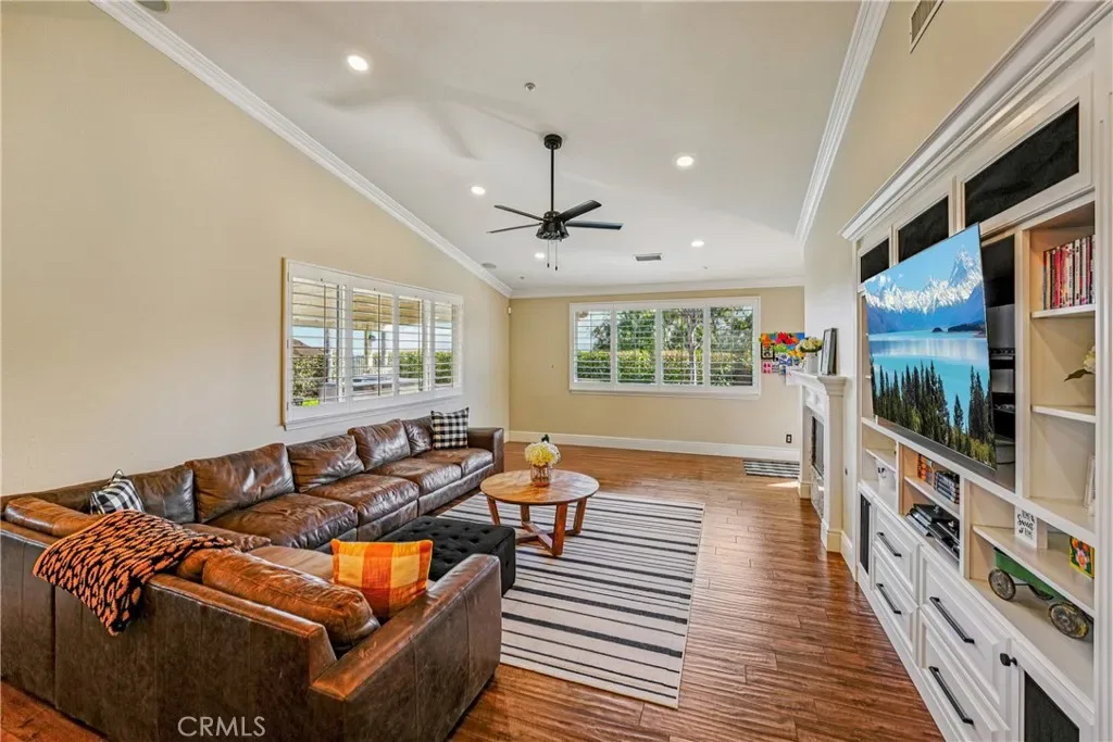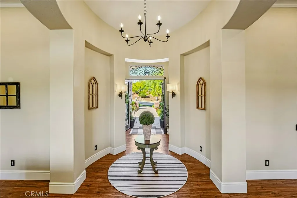 This beautiful, luxury home located in the gated enclave of Seven Oaks, where striking mountain and city views define the exclusive community. Enter the large front entry and you are greeted by a grand living and formal dining room with fireplace and sweeping views. The kitchen was fully redesigned with a large custom wood island, farmhouse sink, soft close real wood cabinetry, new KitchenAid appliances, and contemporary light fixtures, creating both an entertainer’s showcase and chefs kitchen. Adjacent, the spacious family room features a fireplace and views of the gorgeous backyard and mountains. The flex office provide a versatile living area that can be used as office, playroom or a 4th bedroom. The upgraded laundry room has custom cabinetry and upgraded countertops The remodeled theater room features new carpet and luxury finishes, while a beautifully updated guest bathroom and powder room reflect modern taste. One guest bedroom offers a roomy walk in closet, The 2nd guest bedroom features an attached, upgraded bathroom. Built in linen closets throughout the house provide organization and storage. The generously sized primary suite is a true retreat, overlooking the pool and outdoor living area. The upgraded primary bathroom includes an expansive shower, gorgeous design elements, along with a custom walk-in closet. The home feels very spacious and elegant with elevated 17 foot ceilings, custom plantation shutters, and remote control ceiling fans. Outside, the backyard has been completely transformed, featuring a heated pebble tech saltwater pool (2019) with new equipment, custom lighting, an Alumawood patio cover, outdoor barbecue with sink and fridge, and recently redone concrete and landscaping with stone wall fencing that encapsulate privacy and style. The backyard and pool area offer stunning mountain views, providing a backdrop for a serene and private outdoor setting. Additional upgrades include new garage doors and motor, epoxy garage flooring, new cabinets in the garage, new fixtures throughout, and a freshly cleaned and sanitized house vent system. Located in a very exclusive part of South Corona with low HOA, low taxes, top schools, and easy access to freeways and shopping.