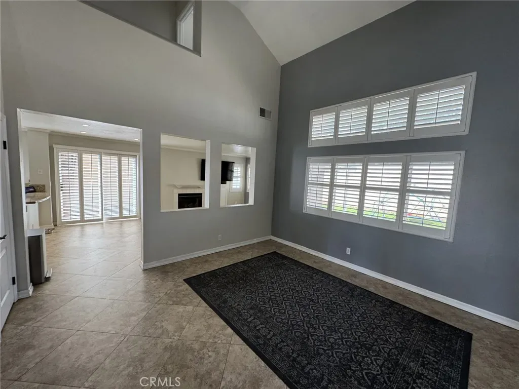 The family room offers a warm and comfortable atmosphere with a cozy fireplace with mantle, ceramic tile flooring, and wood shutters, making it the perfect space to relax or entertain.