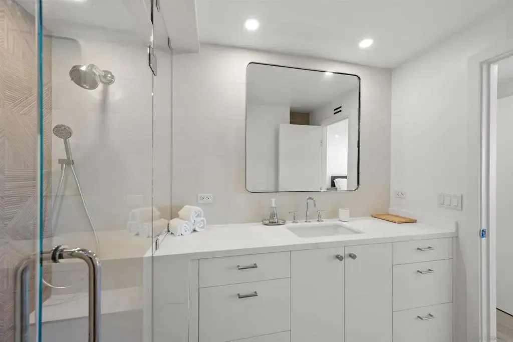 Enjoy the Best of Coronado Beach! Experience coastal luxury from this newly remodeled Penthouse unit in Cabrillo Tower at Coronado Shores. This beautifully upgraded 2-bedroom, 2-bath condo offers breathtaking ocean, City and bay views and stylish modern comfort. The primary bedroom has a comfy king bed, walk in closet. The guest bedroom has 2 : Plush double beds. Gorgeous updated bathrooms with high-end stone finishes and designer fixtures, plus a modern kitchen featuring quartz countertops, Thermador stainless steel appliances, and all-new windows and doors. Relax in your living room with sweeping ocean views or take a short stroll to the historic Hotel del Coronado, local shops, cafés, and restaurants. Resort-style amenities include pools, tennis courts, a fitness center, and secure garage parking for one vehicle.Come unwind and enjoy the best of Coronado beachfront living!