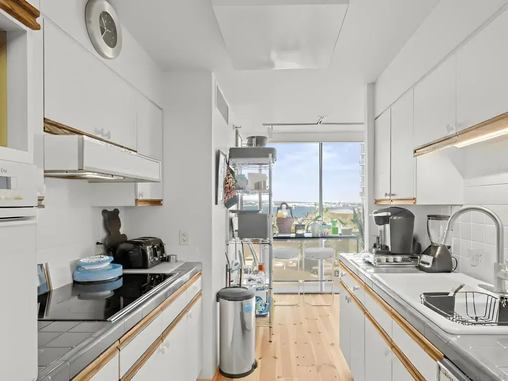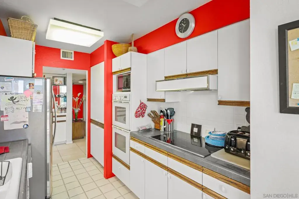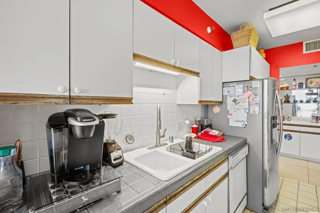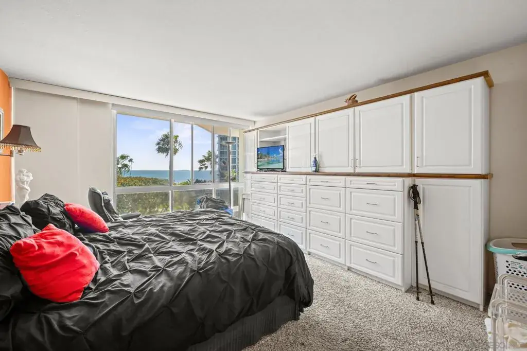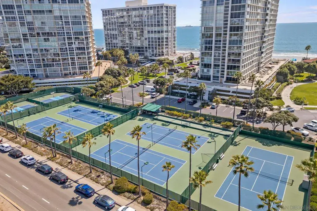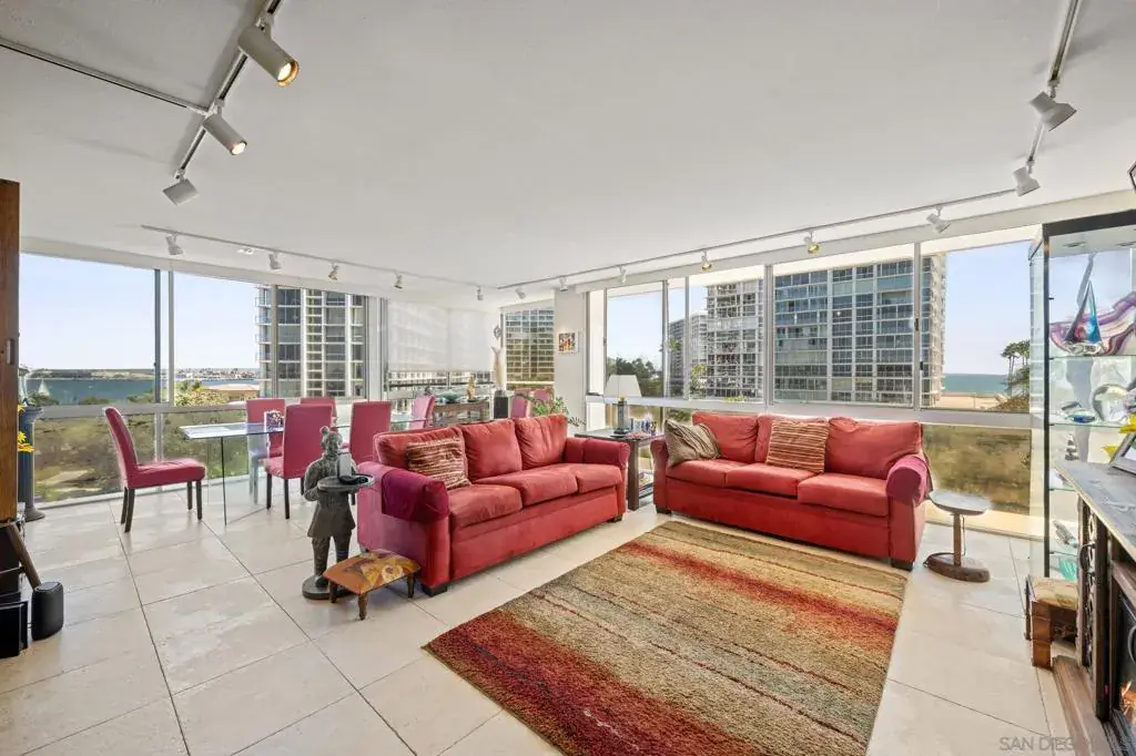 Experience oceanfront living at Coronado Shores in this spacious 2BD, 2-BA residence with 1,350 sq. ft. of living space. This corner unit offers both ocean and San Diego Bay views, a split floor plan with a generous living room, and ample storage throughout. Enjoy panoramic vistas of the Pacific Ocean, San Diego skyline, and palm-lined beaches—all just steps from the iconic Hotel del Coronado. Step inside through a bright, welcoming hallway with modern tile flooring, mirrored closets, and sleek decorative accents that set the tone for the home’s contemporary style. The sun-filled living room features oversized windows framing breathtaking ocean views, a cozy fireplace with built-in display cabinets, and plenty of space to relax or entertain. The galley-style kitchen is both functional and stylish, boasting white cabinetry, gray countertops, bold red accents, and stainless steel appliances—including a built-in oven, cooktop, dishwasher, and refrigerator. A large window fills the space with natural light while capturing stunning bay and city views. Both full bathrooms are thoughtfully updated with modern finishes. One doubles as a functional laundry area, complete with a sleek LG front-loading washer and dryer tucked behind mirrored sliding doors. Each bathroom features spacious vanities, updated fixtures, and tub/shower combos with sliding glass doors. At Coronado Shores, residents enjoy resort-style amenities—four swimming pools, eight tennis courts, a fitness center, and direct beach access.