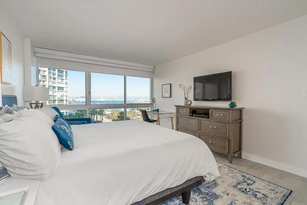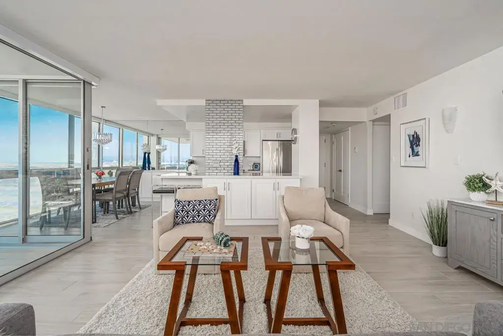 Enjoy the best of Coronado Beach from El Camino Tower. Beautifully remodeled 2 BR/2 BA corner unit boasts gorgeous wraparound ocean and bay views. Comfy King bed in the master, plush Queen bed in guest room. Queen sleeper in the living room. Updated bathrooms. Automated blinds. Beachy tile floors, kitchen with S/S appliances, oversized balcony with seating. One secure parking spot in garage. Quick walk to historic Hotel Del Coronado, shops and restaurants. Enjoy pools, tennis courts and gym.