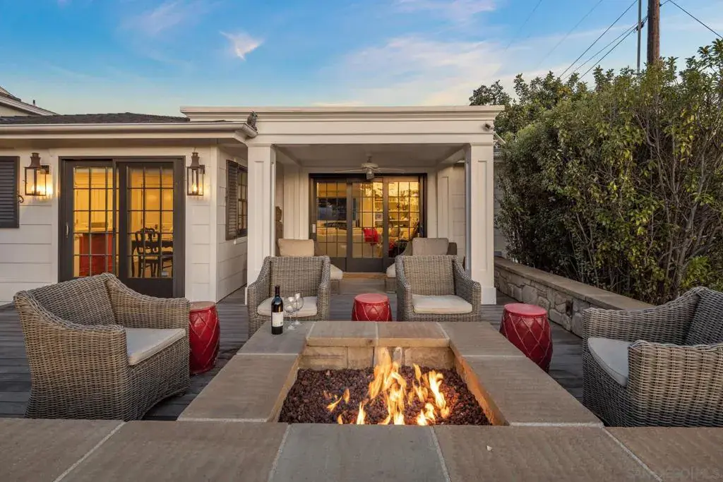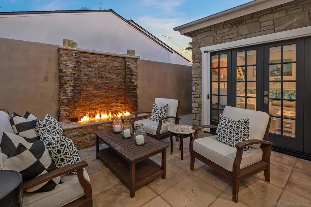 Beautiful coastal elegance – this 3-bedroom, 2.5 bath home is centrally located to town and the beach and sits on a corner lot! Guests will love the indoor/outdoor living spaces this home offers. The front patio is complete with outdoor dining, and plenty of comfy seating including chairs surrounding a gas firepit. The home is impeccably designed with attention to every detail, offers hardwood flooring throughout, and has central AC. The primary bedroom has a king-size bed with a TV, a built-in dresser, and an en suite bathroom. French doors lead you out to a private backyard patio with a jacuzzi and cozy seating around a beautiful fireplace complete with a waterfall feature. Located on the outdoor patio is also the “Cabana room” with a sofa that pulls out to a full-size bed, TV and mini fridge to escape to for fun or use as an office or 4th bedroom. Bedroom 2 has a queen-size bed with a TV and built-in desk. Bedroom 3 has a twin trundle (which can slide out and be made into a king size bed) and dresser. The kitchen is the perfect gathering spot for family and friends with a large island with seating, gourmet appliances, a wine closet, and a dining table. The living room is adjacent to the kitchen and has French doors which open out onto the front patio. A convenient half bath is located off of the kitchen/dining room. Full beach amenities, chairs, an umbrella, and bikes, etc. Highlights include a fully enclosed outside shower to use after a long day at the beach and a walk-in pantry room with a wine fridge. This home is available for short-term and long-term rentals.