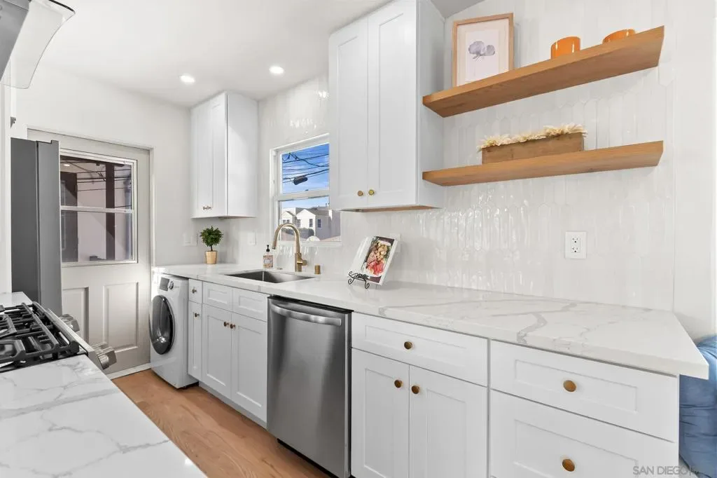 Fully renovated coastal retreat in the heart of Coronado Village. This beautifully redesigned 1BR/1BA residence has been thoughtfully opened to create an airy, light-filled living space with a seamless modern flow. Refinished oak flooring pairs effortlessly with fresh paint, recessed lighting, updated electrical, and clean-lined finishes throughout. The sophisticated kitchen showcases Calacatta countertops, shaker cabinetry, full tile backsplash, floating shelves, and premium appliances, delivering both style and functionality. The spa-like bath has been completely refreshed with new tile flooring and surround, updated vanity, LED mirror, and designer fixtures. Additional enhancements include upgraded insulation, a new front door and hardware, attic improvements, in-unit laundry, and curated exterior updates. Moments from Coronado’s charming boutiques, restaurants, and beaches, this turnkey residence offers effortless luxury island living. Fully renovated coastal retreat in the heart of Coronado Village. This beautifully redesigned 1BR/1BA residence has been thoughtfully opened to create an airy, light-filled living space with a seamless modern flow. Refinished oak flooring pairs effortlessly with fresh paint, recessed lighting, updated electrical, and clean-lined finishes throughout. The sophisticated kitchen showcases Calacatta countertops, shaker cabinetry, full tile backsplash, floating shelves, and premium appliances, delivering both style and functionality. The spa-like bath has been completely refreshed with new tile flooring and surround, updated vanity, LED mirror, and designer fixtures. Additional enhancements include upgraded insulation, a new front door and hardware, attic improvements, in-unit laundry, and curated exterior updates. Moments from Coronado’s charming boutiques, restaurants, and beaches, this turnkey residence offers effortless luxury island living.