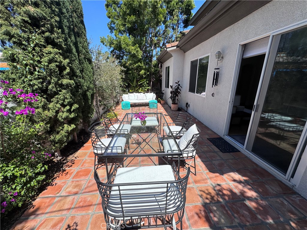 The private backyard features Spanish tile and is surrounded by lush trees and shrubs, creating a quiet, serene setting. Owned solar provides the benefit of a zero-dollar electricity bill.