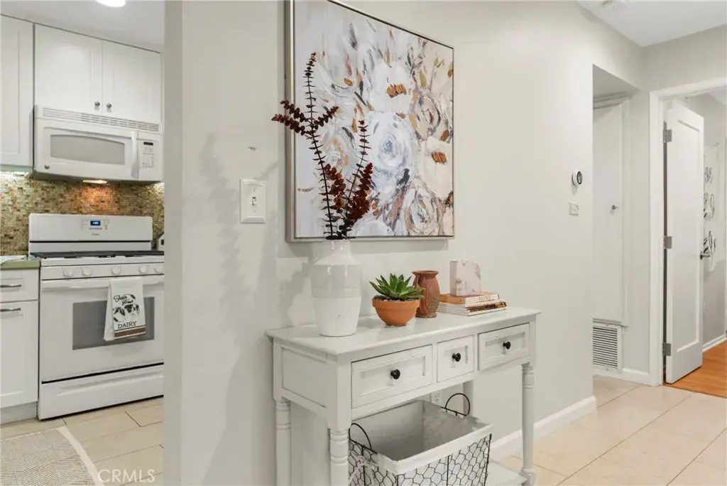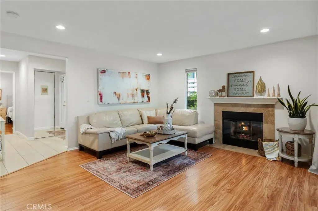 Furnished private & secluded end unit with gated walkway, surrounded by lush landscaped wrap-around stream and waterfalls. Highly updated single-level 1bd Condo with open floor plan, with brand new recessed lighting, enjoy the tranquil and scenic views from every window! Newer Gourmet Kitchen with wood shaker soft close cabinets, quartz countertops, custom glass backsplash with ambient LED lights, white range, and refrigerator. Newer custom bathroom with soft close wood shaker cabinets & linen storage, quartz countertops, newer designer mirror, newer custom ceramic tile throughout! Spacious bedroom with walk-in closet, overlooking nicely landscaped exterior. Cozy up to the Fireplace with newer custom mantel and stone, wood-style flooring. Wood-style blinds in the bedroom, custom wood cornice valances, and a private patio overlooks 2 waterfalls, a peaceful place to call HOME. Completely rebuilt in 2009 with Nest Thermostat, & home security system, plus inside stack laundry unit. Private dry-walled garage with remote garage opener, plus covered parking space. Resort community pool & spa, within walking distance to Starbucks, Dining, TJ Maxx and Home Depot. Great central location easy access to 405/55/73 Freeways and Parks. Perfect yard for a small dog! (Pet-Friendly Community).