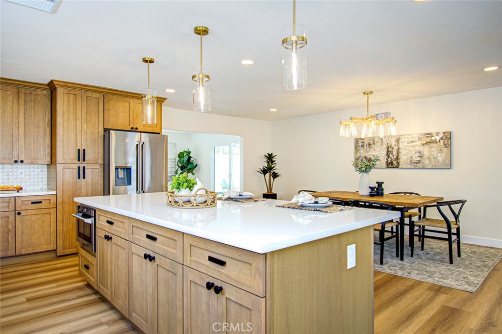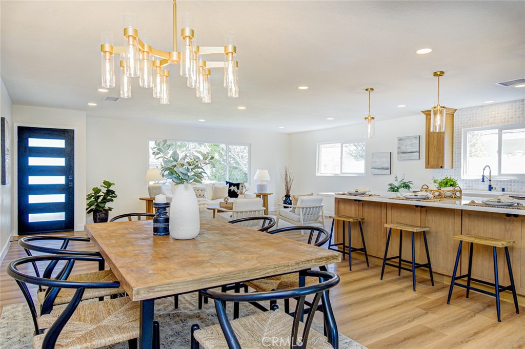 The kitchen flows effortlessly into a dedicated dining area highlighted by a stylish chandelier and opens to a spacious family/rec room—perfect for everyday living and entertaining alike.