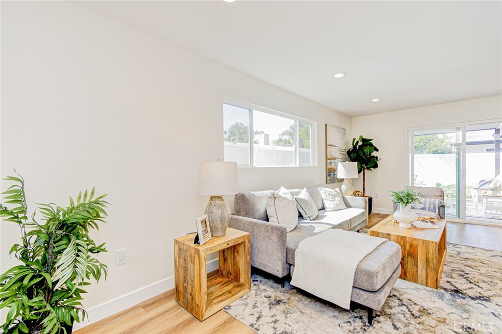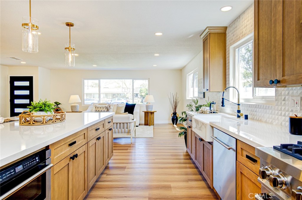 Step inside to an inviting living room with refined finishes that create a warm yet sophisticated atmosphere. At the heart of the home, the fully redesigned chef’s kitchen impresses with custom cabinetry, quartz countertops, a designer marble backsplash, a custom range hood, and high-end appliances—including a premium range, built-in microwave drawer, dishwasher, and French-door refrigerator.