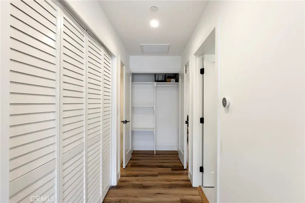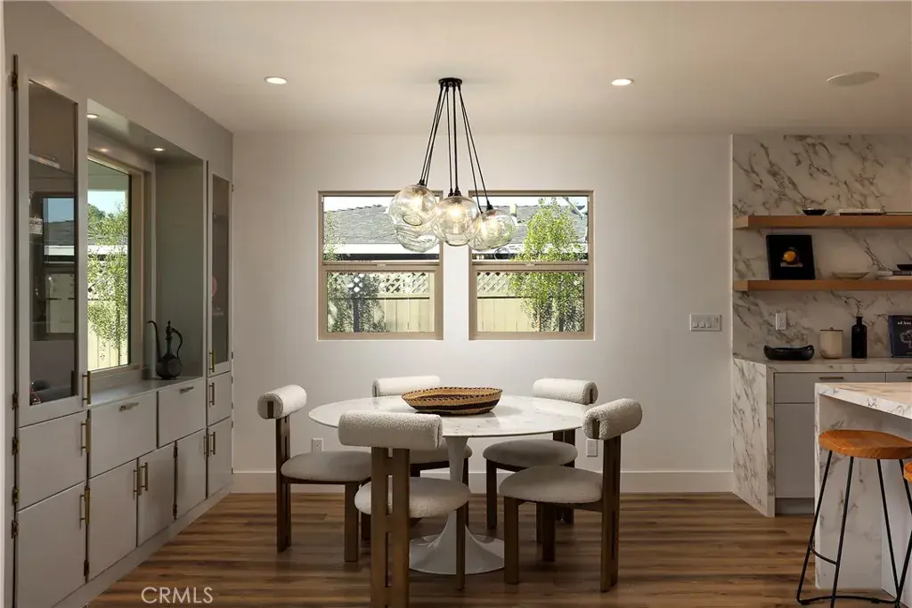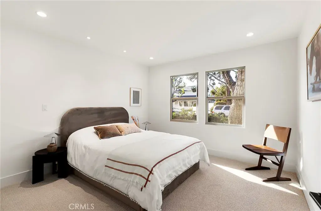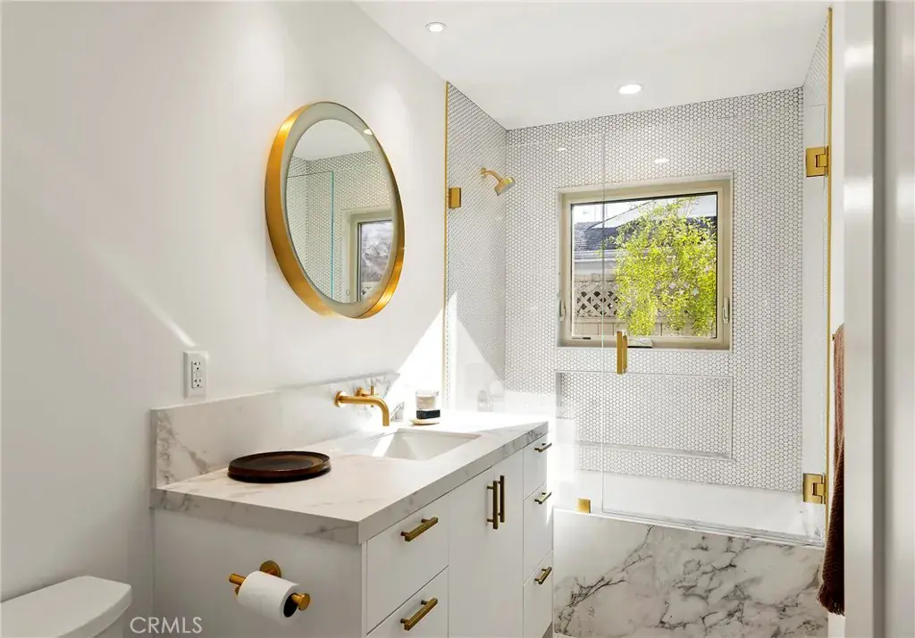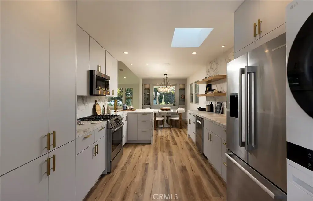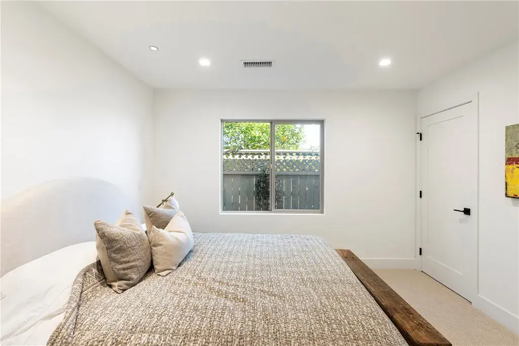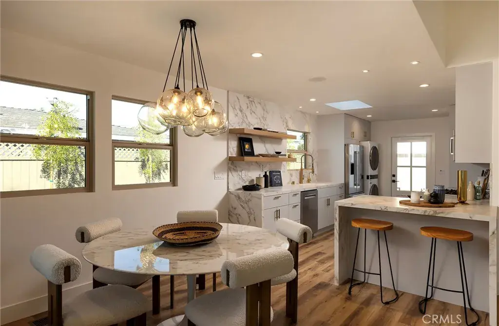The front residence is a reconfigured single-level home offering approximately 1,640 square feet of light-filled living space. Open interiors, high ceilings, skylights, and expansive sliding glass doors create an effortless connection to the outdoors. Wide-plank vinyl flooring runs throughout the main living areas, while the kitchen is finished with Calacatta Venato porcelain countertops, custom cabinetry, and premium appliances. The primary suite features dual closets and a thoughtfully designed bath with elevated tile selections, complemented by well-appointed secondary bathrooms that maintain a consistent design aesthetic.