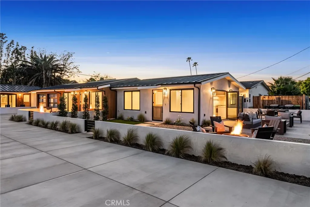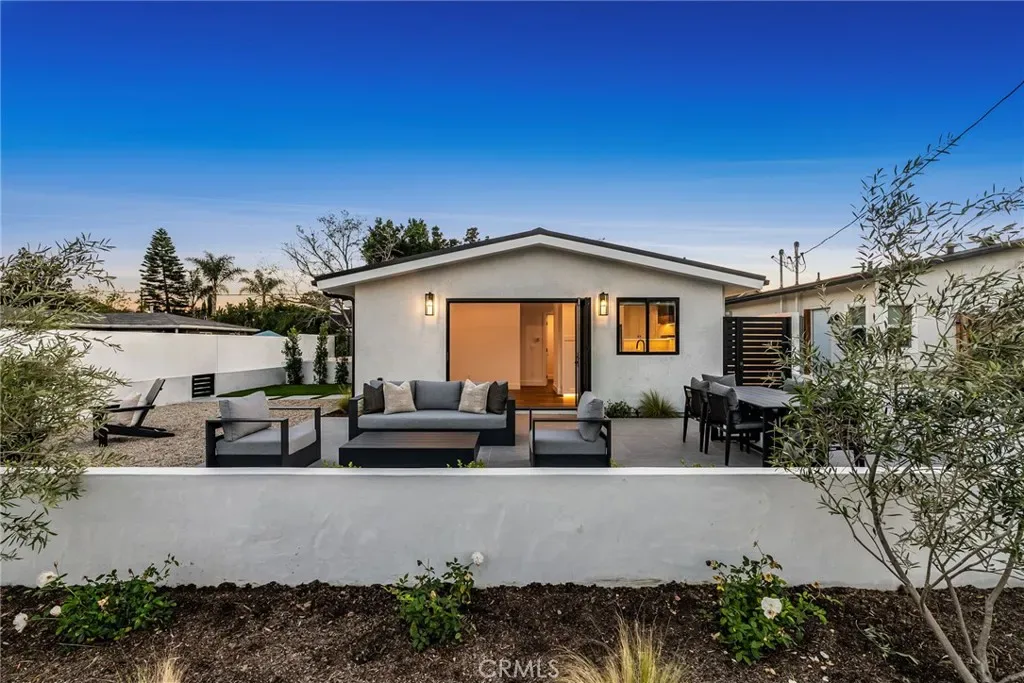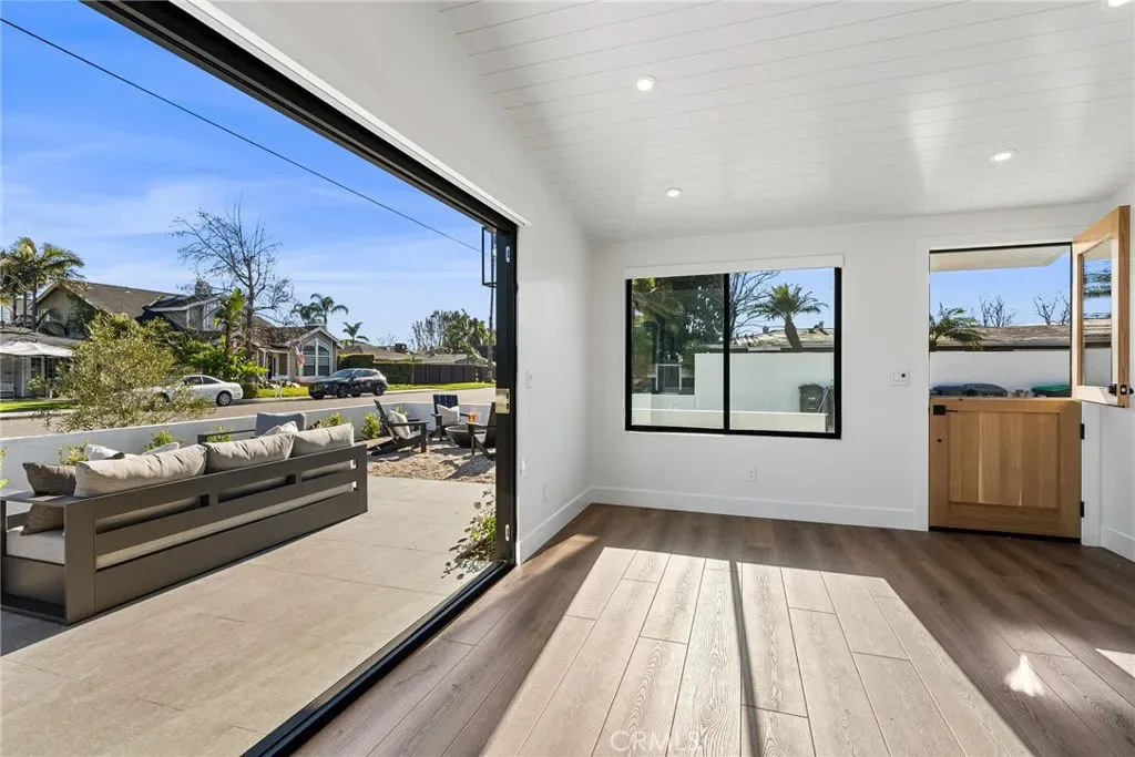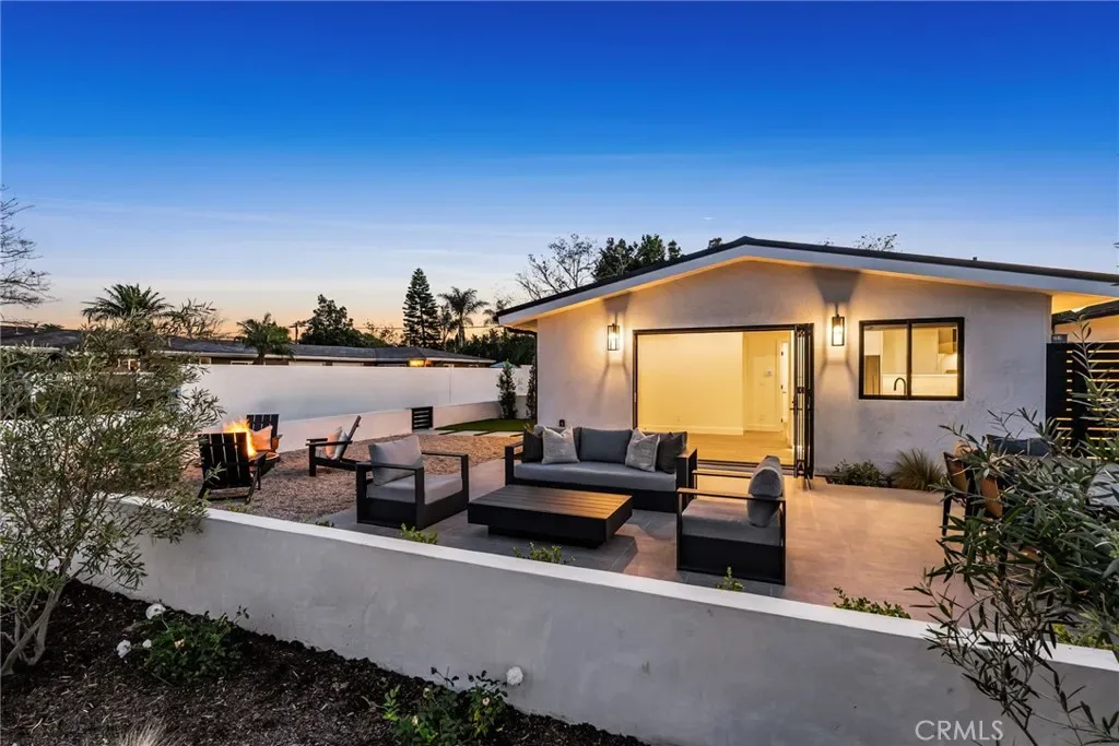 The living area opens seamlessly to a fully furnished private front patio complete with stylish outdoor seating and a gas firepit — perfect for entertaining or enjoying Costa Mesa’s year-round coastal climate.