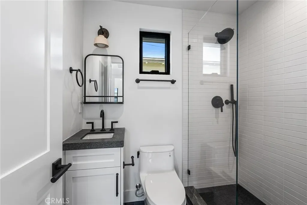 Both bedrooms offer clean, modern lines and efficient use of space, while the bathroom continues the home’s upscale aesthetic with designer tile and high-end fixtures. The property also includes convenient in-unit laundry for everyday ease.