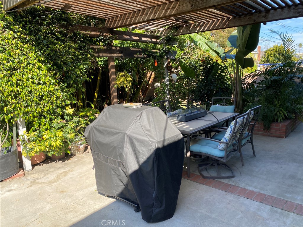 The backyard features a covered patio, and fruit trees including banana, lemon and avocado!
