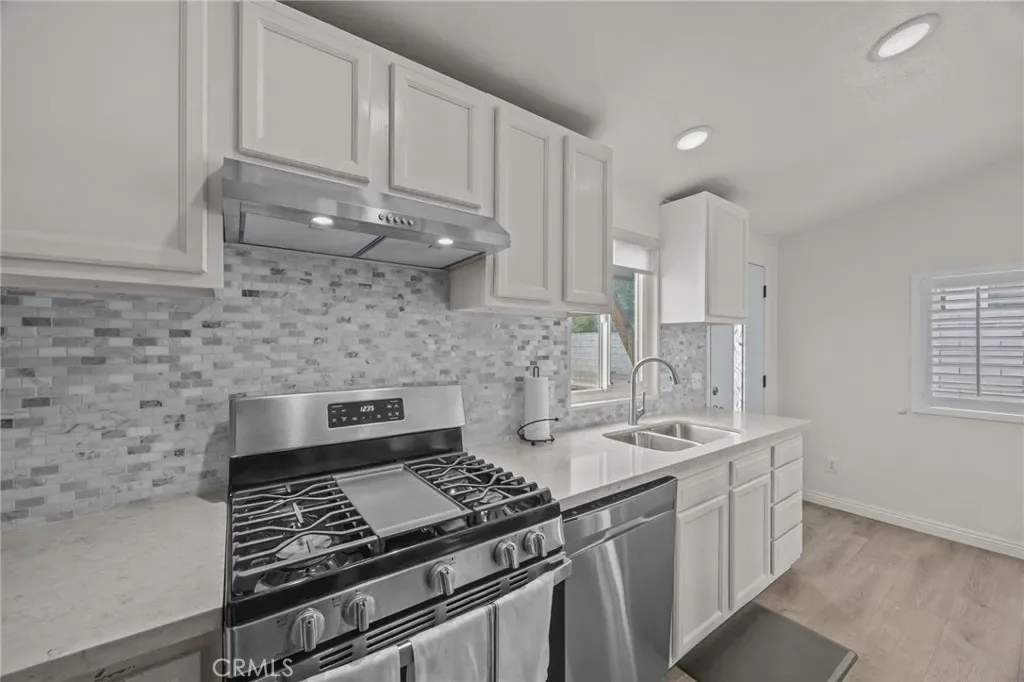 • Designer Kitchen: Features stunning Quartz countertops, a custom tile backsplash, and a deep stainless steel sink with a new disposal. The chef-inspired space includes a 5-burner gas stove and high-end stainless steel appliances.