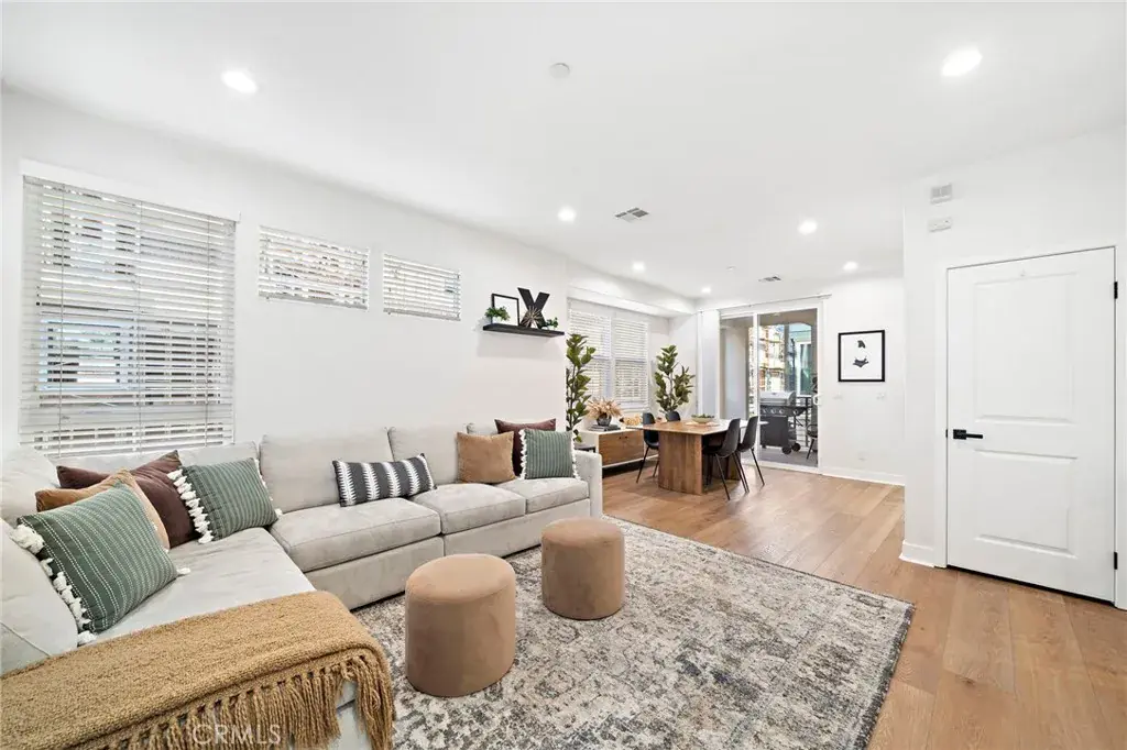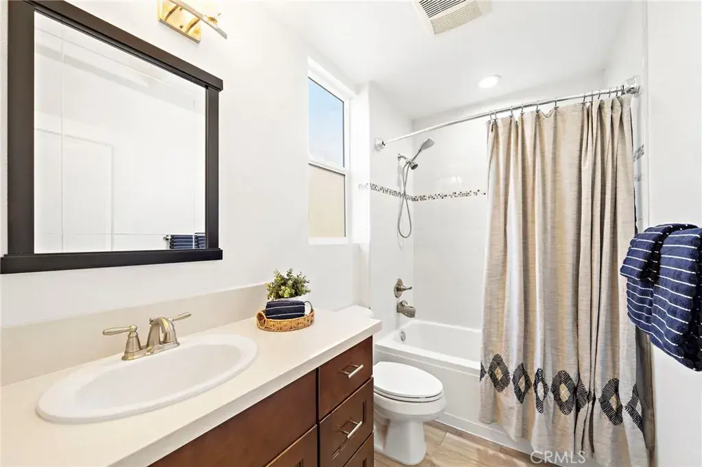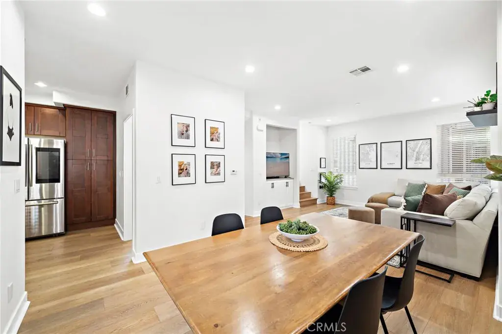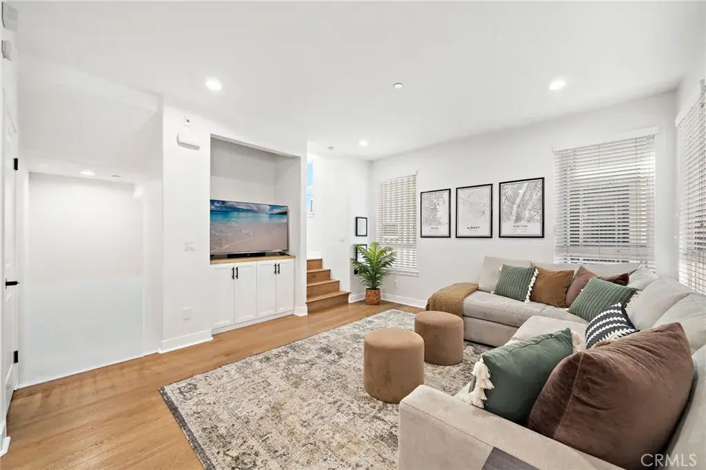 The Cadence Community is an exclusive enclave of only five beautifully designed single-family homes built in 2016 with low HOA, showcasing modern luxury finishes throughout three stylish levels and ideally located in Costa Mesa’s vibrant Westside, where exciting revitalization continues daily with an ever-growing selection of dining and shopping destinations unlike anywhere else in Orange County. This sleek and stunning residence offers an impressive layout beginning with a first-floor foyer and flexible workspace area, an inside laundry room with added cabinetry, and direct access to the finished two-car garage featuring an epoxy floor and built-in overhead storage. The second level reveals a light-filled open-concept living space highlighted by a spacious living room with media niche and chic floating shelving, a full-size dining area, a gourmet granite kitchen with upgraded soft-closing cabinetry and stainless steel appliances, a beautifully remodeled powder room with quartz vanity, and a sliding door that opens to a convenient balcony—perfect for barbecuing, evening dining, or sipping morning coffee with refreshing ocean breezes, as the home is just minutes from the surf and sand of Newport Beach. The upper level features a generous landing with custom built-in white shaker cabinetry and extended counter space, along with two spacious ensuite bedrooms. The primary suite offers a large mirrored walk-in closet with extensive California Closet custom organizers, dual sinks, a tub/shower combination with clear glass enclosure, updated lighting, and a private water closet, while the secondary suite also features a mirrored organized closet and a tub/shower bath with designer tile surround. Additional highlights include volume ceilings, central air conditioning, luxury waterproof vinyl flooring throughout, dual-pane windows, custom window blinds, abundant recessed lighting, raised-panel interior doors, and tall baseboards, along with direct access from the garage to a private fenced backyard and an additional private parking space adjacent to the garage. Excellent Newport-Mesa schools serve the area, including award-winning Estancia High School with a newer football field, swimming pool, and state-of-the-art theater.