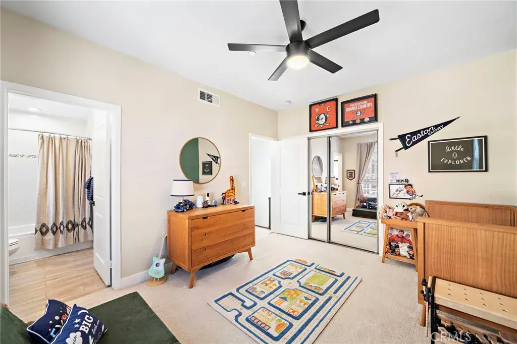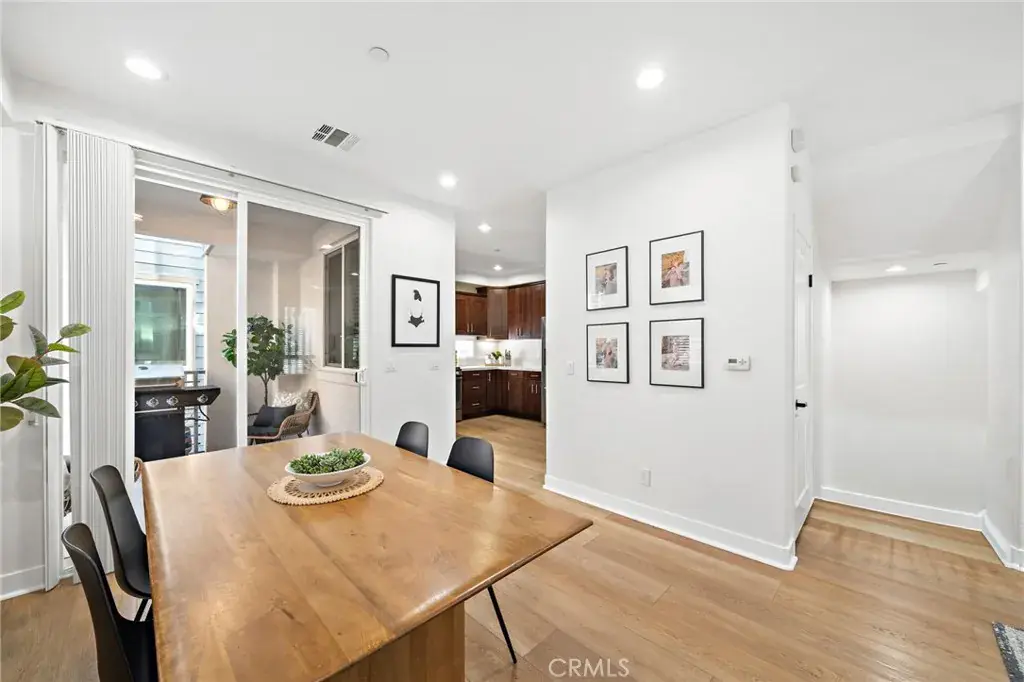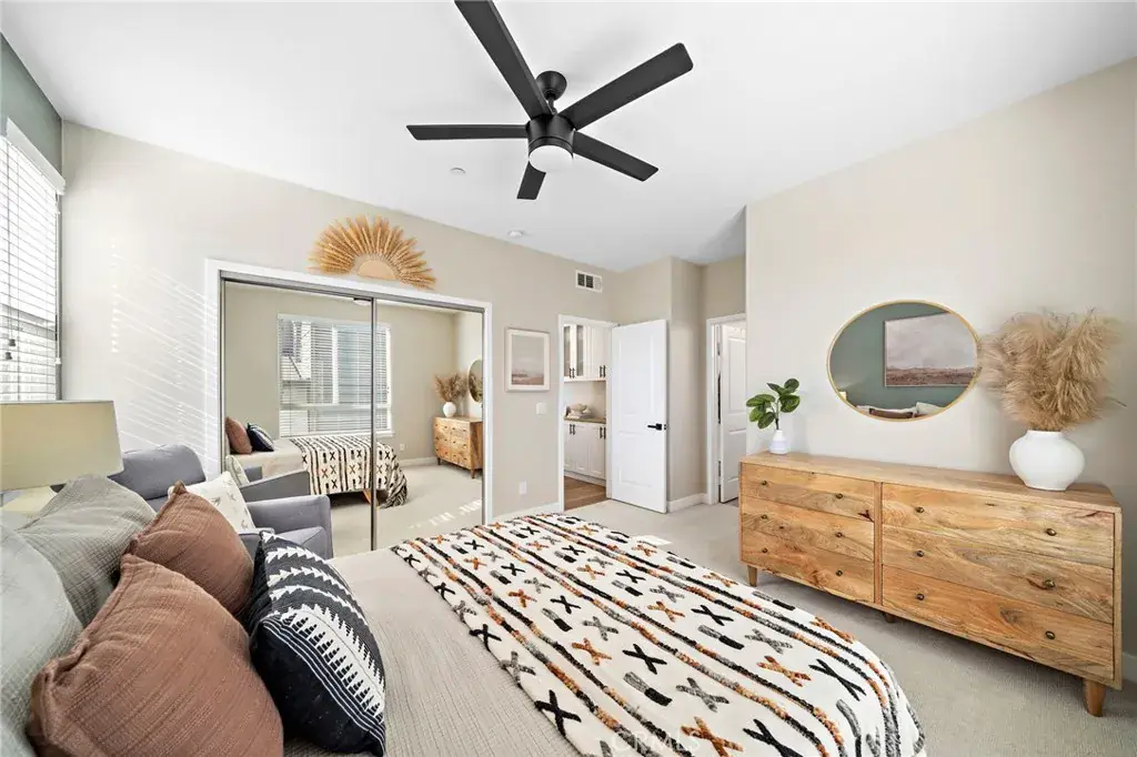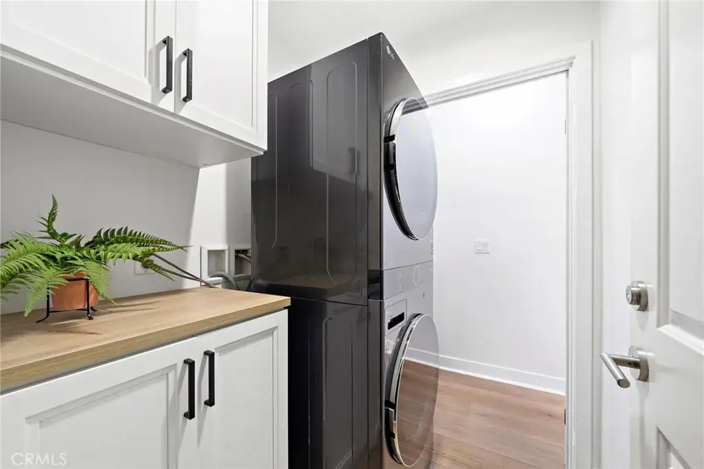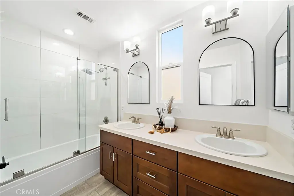 The Cadence Community is an exclusive enclave of only five beautifully designed single-family homes built in 2016 with low HOA, showcasing modern luxury finishes throughout three stylish levels and ideally located in Costa Mesa’s vibrant Westside, where exciting revitalization continues daily with an ever-growing selection of dining and shopping destinations unlike anywhere else in Orange County. This sleek and stunning residence offers an impressive layout beginning with a first-floor foyer and flexible workspace area, an inside laundry room with added cabinetry, and direct access to the finished two-car garage featuring an epoxy floor and built-in overhead storage. The second level reveals a light-filled open-concept living space highlighted by a spacious living room with media niche and chic floating shelving, a full-size dining area, a gourmet granite kitchen with upgraded soft-closing cabinetry and stainless steel appliances, a beautifully remodeled powder room with quartz vanity, and a sliding door that opens to a convenient balcony—perfect for barbecuing, evening dining, or sipping morning coffee with refreshing ocean breezes, as the home is just minutes from the surf and sand of Newport Beach. The upper level features a generous landing with custom built-in white shaker cabinetry and extended counter space, along with two spacious ensuite bedrooms. The primary suite offers a large mirrored walk-in closet with extensive California Closet custom organizers, dual sinks, a tub/shower combination with clear glass enclosure, updated lighting, and a private water closet, while the secondary suite also features a mirrored organized closet and a tub/shower bath with designer tile surround. Additional highlights include volume ceilings, central air conditioning, luxury waterproof vinyl flooring throughout, dual-pane windows, custom window blinds, abundant recessed lighting, raised-panel interior doors, and tall baseboards, along with direct access from the garage to a private fenced backyard and an additional private parking space adjacent to the garage. Excellent Newport-Mesa schools serve the area, including award-winning Estancia High School with a newer football field, swimming pool, and state-of-the-art theater.
