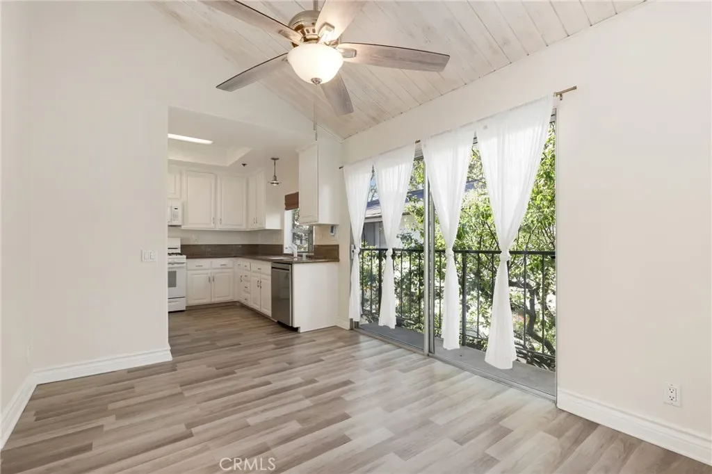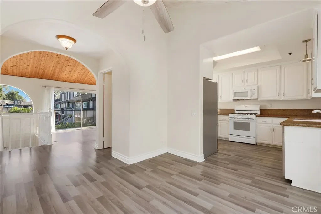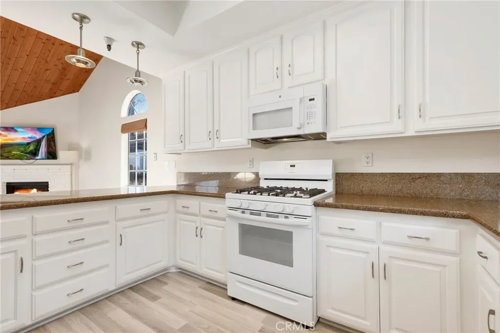 This open and airy home features vinyl flooring throughout, smooth ceilings, designer paint colors, and an inviting formal dining area with a balcony. The spacious living room offers soaring cathedral ceilings, a cozy fireplace, and a private balcony, perfect for morning coffee or evening relaxation.