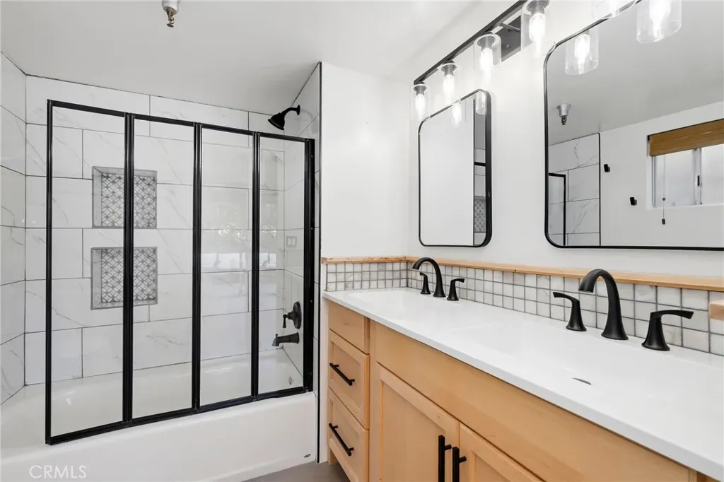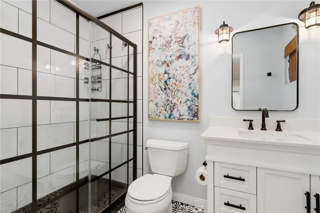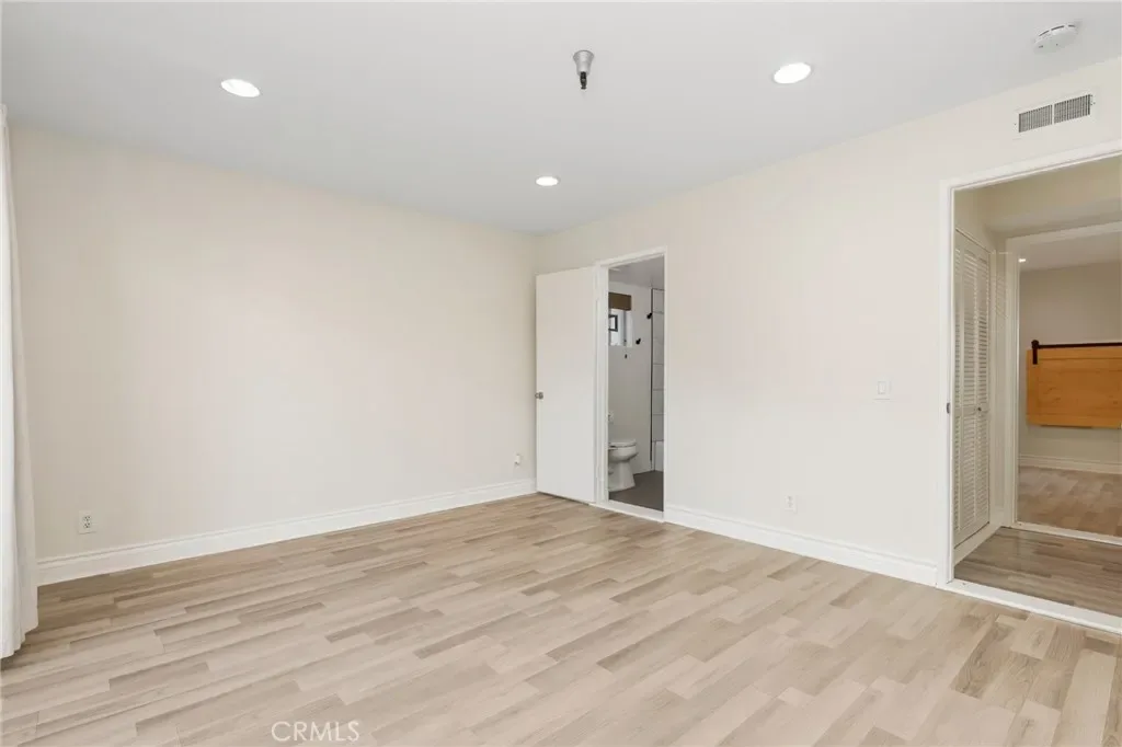 The home offers dual primary bedrooms, each with its own beautifully remodeled en-suite bathroom, plus a convenient guest powder room on the main living level. The kitchen includes granite countertops and ample cabinetry. Additional highlights include a newer gas heater, an inside laundry closet with gas hookups, generous storage, and a private patio off one of the bedrooms.