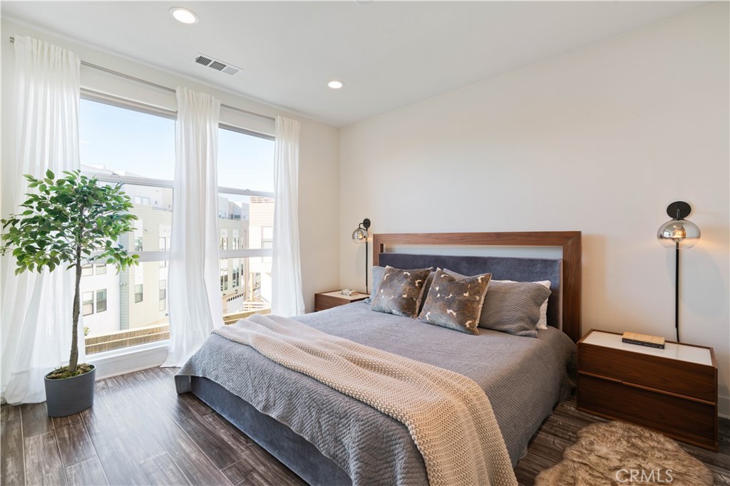 This four-level contemporary residence spans approximately 2,142 square feet and features three ensuite bedrooms, two powder rooms, and a versatile flex space ideal for a home office, media room, or guest suite. The open-concept main living level is filled with natural light, enhanced by high ceilings, expansive windows, and premium porcelain tile flooring that create a bright, airy atmosphere throughout the day. Morning light fills the kitchen and dining areas, while golden sunset light pours into the living spaces and balconies in the evening.