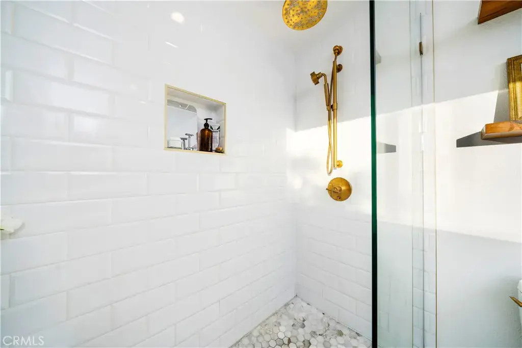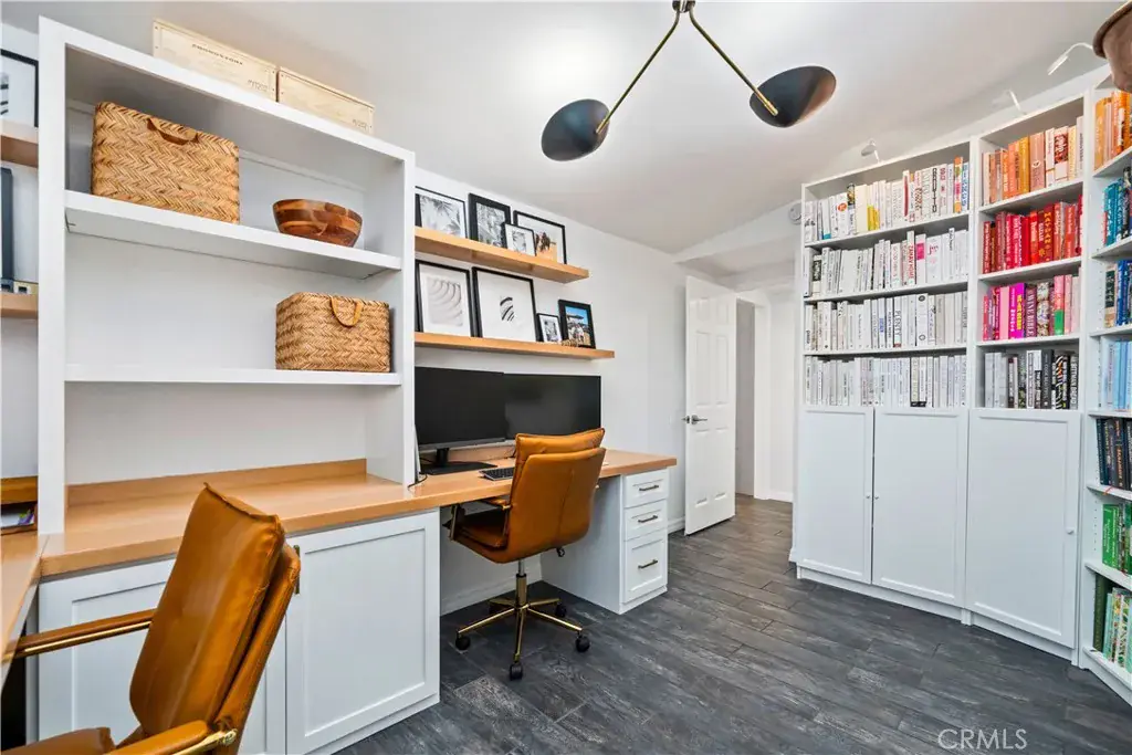 A third bedroom—currently styled as a home office—features custom built-ins with beechwood desktops, creating a space that’s both functional and beautiful. The hallway bathroom has also been thoughtfully remodeled with quartz counters and crisp white beveled subway tile in the shower.