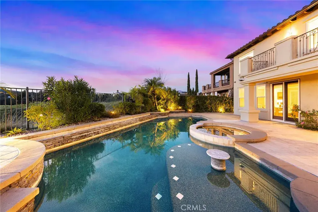 Exceptional Fairway and Hillside Views! Rarely available fairway-front luxury residence on the 9th Fairway of Coto de Caza’s South Course, within prestigious 24-hour guard-gated community, offering panoramic golf course and hillside vista and meticulously designed resort-style backyard. This stunning estate showcases refined craftsmanship and premium materials increasingly rare in today’s new construction, w/ extensive upgrades and custom features throughout. Situated on approx. 8,401 sq ft lot, property offers approx. 4,398 sq ft of refined living space w/ 4 bedrooms, 4.5 bathrooms, dedicated downstairs office, and oversized upstairs loft. From formal entry, natural stone foyer leads to private office w/ custom built-ins and stylish powder room, while formal living room is highlighted by soaring 2-story ceilings, dramatic fireplace and sweeping custom curved staircase w/ natural stone treads, ornate wrought-iron balustrades, and rich wood detailing. Gourmet kitchen showcases large center island w/ granite countertops, custom wood cabinetry, walk-in pantry, and full suite of high-end Viking appliances, flowing into two dining areas and grand family room w/ fireplace. Formal dining room opens to backyard through double doors, while kitchen and secondary dining area are surrounded by abundant windows capturing outdoor views. Desirable main-floor bedroom suite features en-suite bathroom and direct backyard access, ideal for guests or multigenerational living. Upstairs, the luxurious primary suite features a fireplace, a scenic retreat area, and a private balcony with breathtaking panoramic golf course and hillside vistas. The remodeled spa-inspired primary bathroom continues the stunning, unobstructed golf course views from the soaking tub and walk-in shower, and includes a custom California Closets walk-in closet. Expansive upstairs loft w/ custom wet bar & stone accent wall. Two additional upstairs en-suite bedrooms offer spacious layouts and upgraded bathrooms, one w/ private balcony. A true resort-style oasis, the backyard offers PebbleTec pool & spa, built-in BBQ, and covered pavilion, all overlooking picturesque golf course & rolling hills, delivering an elevated luxury outdoor living experience. Additional upgrades include newly replaced HVAC system, 3-car garage w/ epoxy flooring and high-end carriage-style garage doors, water softening & filtration systems, plantation shutters & custom window shades, and more. A truly exceptional luxury offering