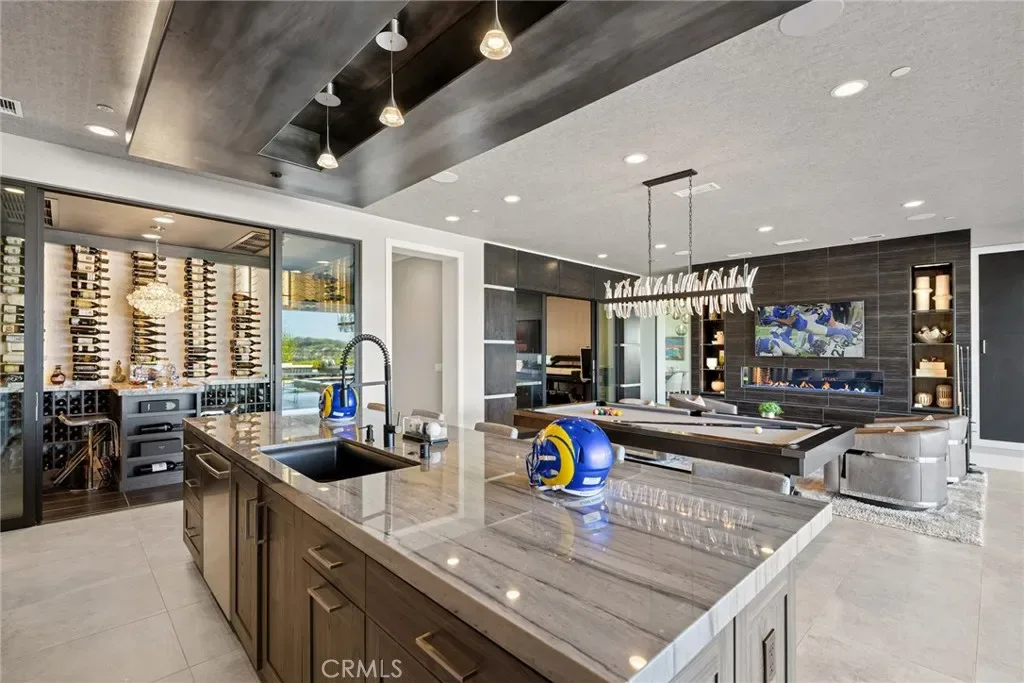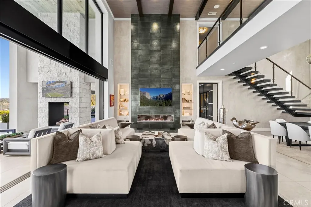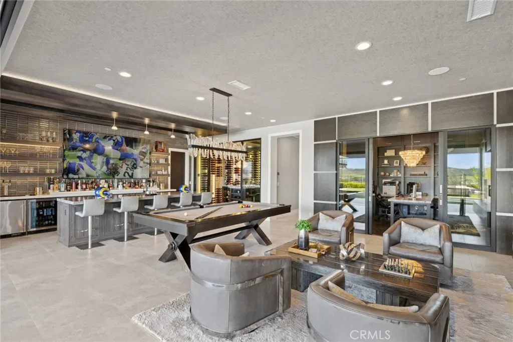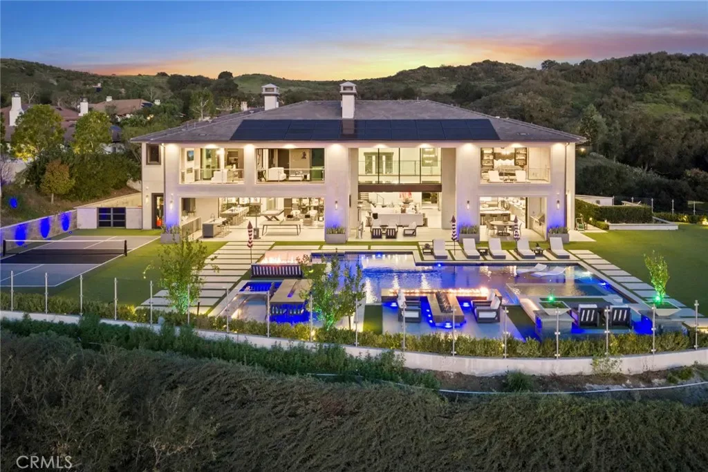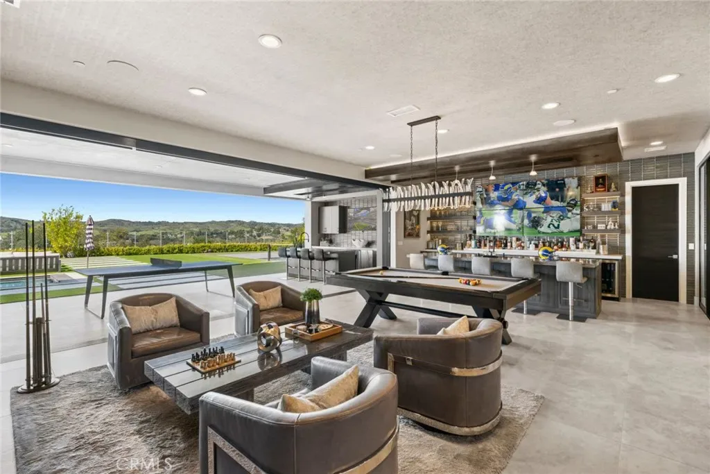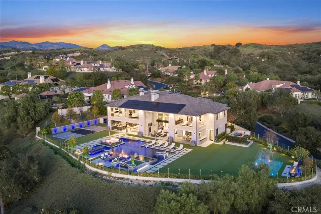 Set on an exceptionally private 1.7-acre corner lot with 180-degree sunset views, this marquee estate stands as one of the most architecturally significant & design-forward residences ever introduced to Coto de Caza. Built just 5 years ago, this modern masterpiece spans over 8,050 sqft of refined interior living & over 3,000 sqft of resort-caliber covered outdoor space. A dramatic open-concept two story great room is wrapped in floor-to-ceiling glass with expansive pocket doors spanning the entire rear of the home. A commanding linear fireplace anchors the family room, while custom wallpaper, statement chandeliers & sculptural sconces adorn every space. Two kitchens with the highest caliber of appliances and two elongated islands provide exceptional versatility for sophisticated entertaining. A dramatic game room features a custom floor-to-ceiling fireplace, restaurant-grade bar that extends directly to the outdoor entertaining areas, 7 tvs placed to capture synchronized viewing or multiple games at once and a temperature-controlled wine room. The primary suite is a private sanctuary, complete with a retreat, fireplace-equipped covered deck overlooking the valley, spa-inspired bathrooms with his-and-her showers, water closets & expansive custom closets. The downstairs guest suite showcases an en-suite bath & separate exterior entrance. Every upstairs bedroom is appointed with its own luxury en-suite, walk in closet, private balcony & sweeping valley views. Outdoors the home transforms into a private oasis anchored by a resort-sized pool & spa with swim-up bar, dining table with cascading water feature, 2 story linear fireplace, 3 fire features, splash pad & multiple covered & open-air entertaining spaces designed for grand-scale events. Private pickleball court further elevates the property into a class of its own. Exterior landscape lighting can be customized to the color selection of your choice. Additional highlights include 3 laundry rooms, Lutron-integrated lighting & automated blinds, whole-home & yard Sonos sound systems, solar power, fully integrated security system & a sleek black photo room, easily adaptable as a pet spa. 4-car garage & parking for up to ten vehicles accommodate collectors and guests with ease, while the corner-lot positioning ensures extraordinary privacy and uninterrupted serenity. This is not simply a residence—it is a flagship statement property, meticulously designed to deliver balance and the ultimate elevated lifestyle.