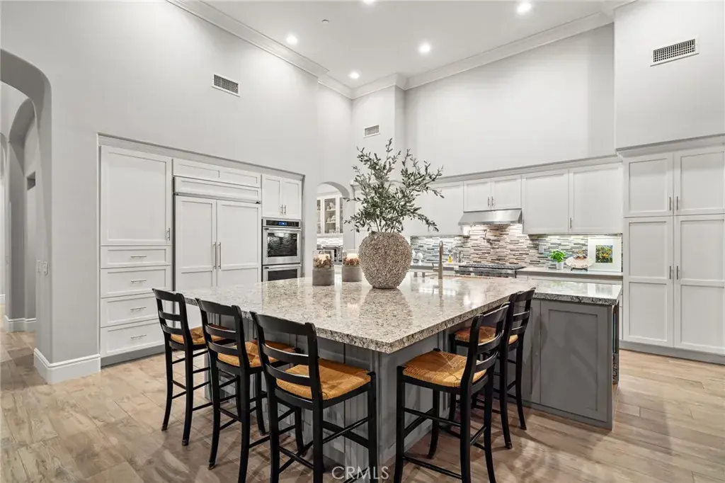 As you enter, you’re greeted by 20-foot vaulted ceilings adorned with elegant 10-inch crown molding, setting the tone for the grandeur that unfolds. The antimicrobial porcelain tile floors promise both durability and elegance. The heart of the home, the kitchen, is a chef’s dream — a space where culinary creativity and style unite. It features a custom-designed large center island, premium finishes, ample storage, and entertaining areas, seamlessly flowing into the family room, ideal for gatherings with sweeping views of the private, lush backyard.