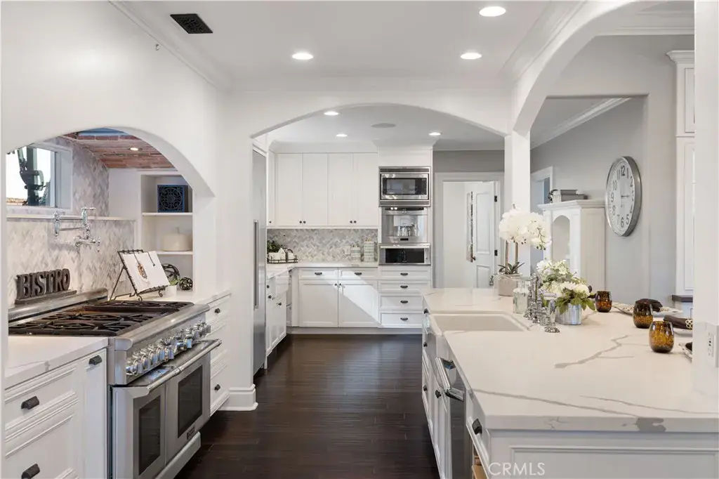 Spanning nearly two acres at the end of a cul-de-sac, this private estate combines space, seclusion, and nearly $300K in recent renovations to create something truly rare. Arrive to manicured landscaping, a three-car garage and abundant architectural charm with fresh paint inside and out. Hardwood floors flow throughout the main and upper levels. Inside, a two-story foyer opens to formal living and family rooms each with a brick fireplace. The dining area flows into the kitchen, framed by walls of custom built-ins. Home chefs will love the high-end Thermador appliances, including a refrigerator, range with dual ovens, three mini-refrigerators, microwave, coffee machine, three dishwashers, and a walk-in pantry. The kitchen is newly updated with quartz countertops and breakfast bar, tile backsplash, Italian faucets for dual farmhouse sinks and a pot-filler. This level also includes a versatile bedroom and multiple sets of French doors for outdoor living. Modern infrastructure is integrated throughout, including a security system, wired ethernet, six mounted smart TVs, and Sonos surround sound. The home is equipped with 49 fully paid solar panels, two HVAC systems with new ductwork, new water heater, smart thermostats, and Tesla and CCS1 Level 2 EV chargers. Upstairs, the primary suite offers vaulted ceilings, private fireplace, and a fully remodeled spa-inspired bath. An attached retreat can serve as an office, nursery, or gym. Four additional bedrooms on this level each feature new carpet over hardwood and upgraded mirrored closets, alongside a flexible guest room and a beautifully renovated laundry. Two more baths on this level have also been fully remodeled. The grounds are designed for entertaining, featuring a newly remodeled California room with recessed lights, ceiling fans, heat lamps, herringbone fireplace, 80″ TV and outdoor kitchen with Lynx infrared grill, dual burners, quartz counters and refrigerator. The generous side patio and fenced yard features a lush lawn backing to mature trees. The lot size offers potential to build a pool, spa or equestrian facilities. Additional improvements include a new double waterproof roof in 2024, waterproofed walls, and gutter railings. Residents enjoy exclusive amenities including horse trails and the renowned Golf & Racquet Club with two championship courses, tennis courts, gym, and clubhouse. Ideally positioned near diverse shopping and dining, this property offers a sophisticated and sought-after lifestyle.