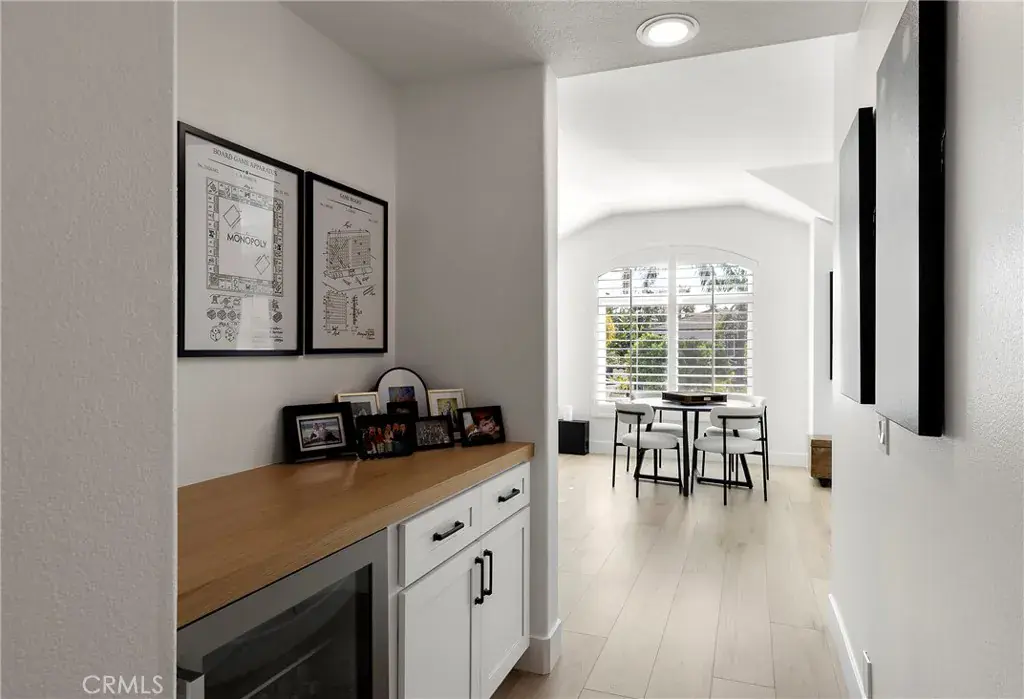 The entry unfolds into an airy, open concept interior anchored by updated windows and a sweeping wrought iron wraparound staircase. At the heart of the home, a custom designed bar and wine experience features tailored cabinetry, quartz surfaces, dual wine refrigerators, and a beverage fridge, creating an effortless focal point for entertaining. Throughout the home, nearly 94,000 dollars in recent upgrades reflect a commitment to both design and function, from updated lighting and fireplace inserts to refined electrical improvements and custom storage solutions.
