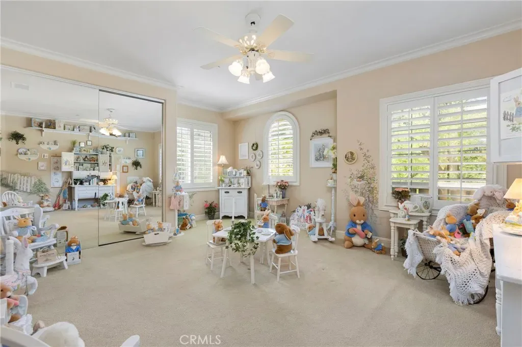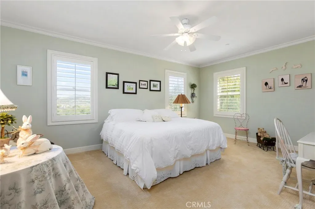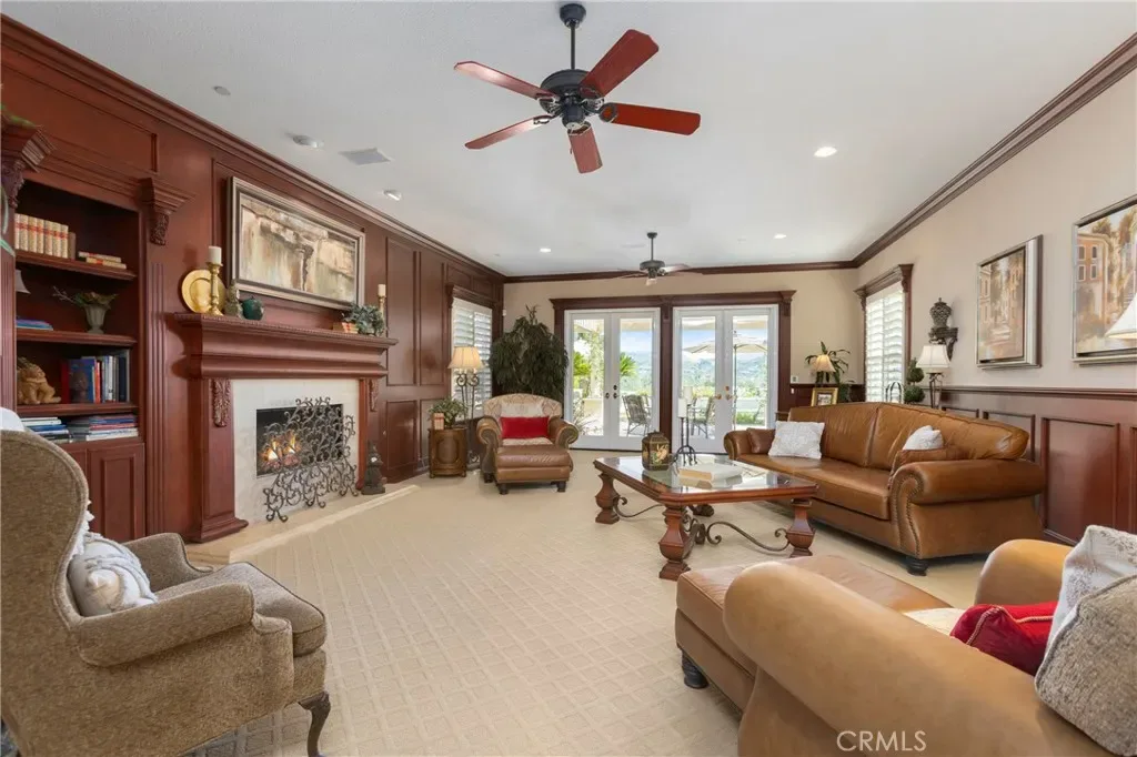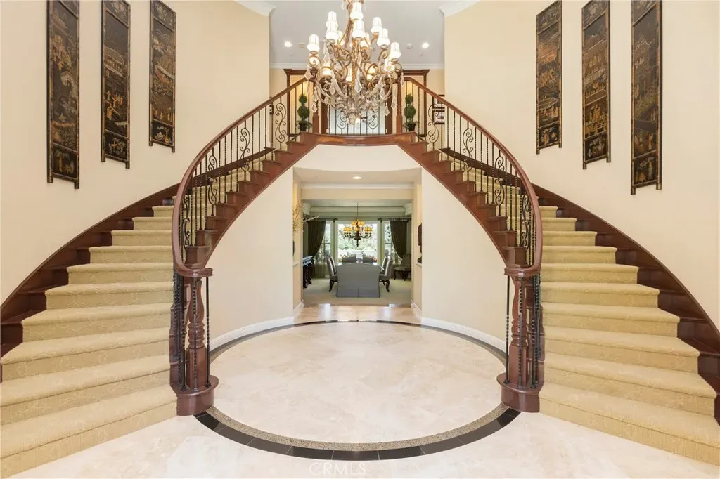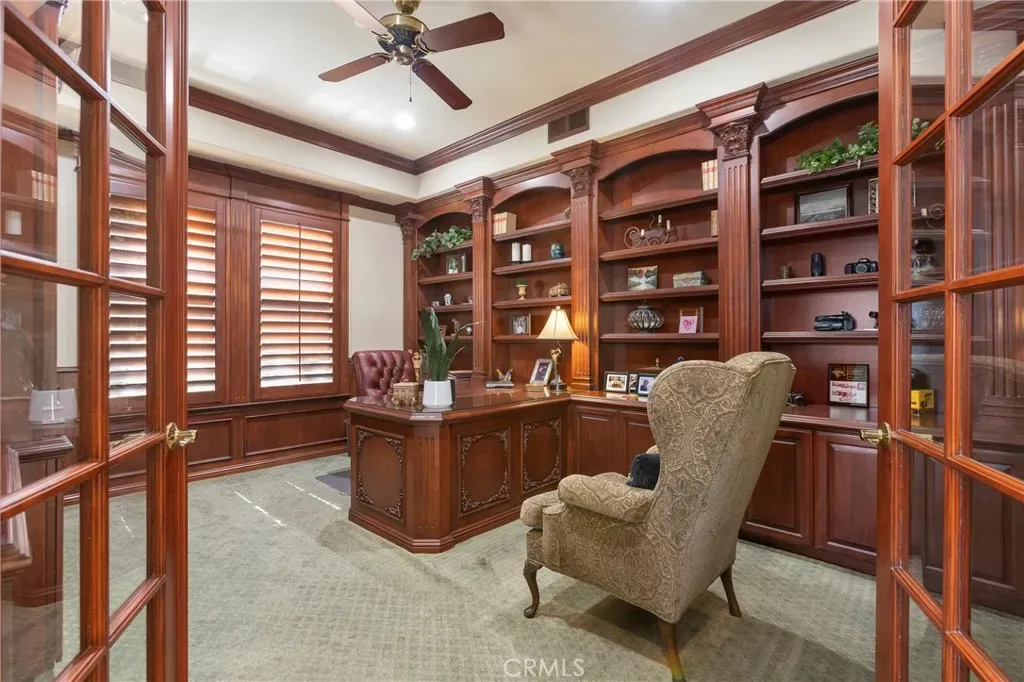 The 5,854 sf home boasts 5 spacious bedrooms with ensuite baths plus a powder room, library, and bonus room. It is defined by soaring ceilings, rich travertine flooring, interior and exterior surround sound system, and 4 inviting fireplaces creating warmth and comfort. Meticulous attention to detail is evident at every turn, including whimsical trompe l’oeil, polished architectural details such as art niches, and wainscoting throughout. The grand foyer makes a striking first impression flanked by sweeping dual staircases as it opens to the banquet-sized dining room and formal living room. A distinguished library provides the perfect retreat, while the upstairs bonus room offers a versatile flex space to serve changing needs. The library, family room, and upstairs bonus feature detailed custom cabinetry designed for function and style. The chef’s kitchen is as welcoming as it is impressive, featuring stainless steel appliances including a Sub-Zero refrigerator, center island, and access to a large laundry room. The charming breakfast nook opens to a tranquil “secret garden” with soothing fountain and lush greenery. The family room with custom cabinetry and numerous French doors invite a fluid transition between indoor and outdoor living. The expansive owner’s suite includes a tranquil sitting room and dual walk-in closets. The bath area delights with a walk-in shower, relaxing Jacuzzi tub, and his and hers vanities and commodes. A covered view deck completes the experience and is perfectly situated to relax and enjoy your morning coffee or a quiet evening under the stars.